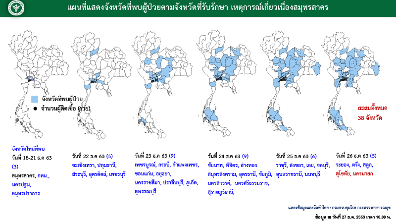 ทั้งนี้ตั้งแต่วันที่ 18 ธ.ค.จนถึงปัจจุบัน พบผู้ติดเชื้อเชื่อมโยงถึงตลาดกลางกุ้ง จ.สมุทรสาคร กระจายตัวอยู่ใน 38 จังหวัด