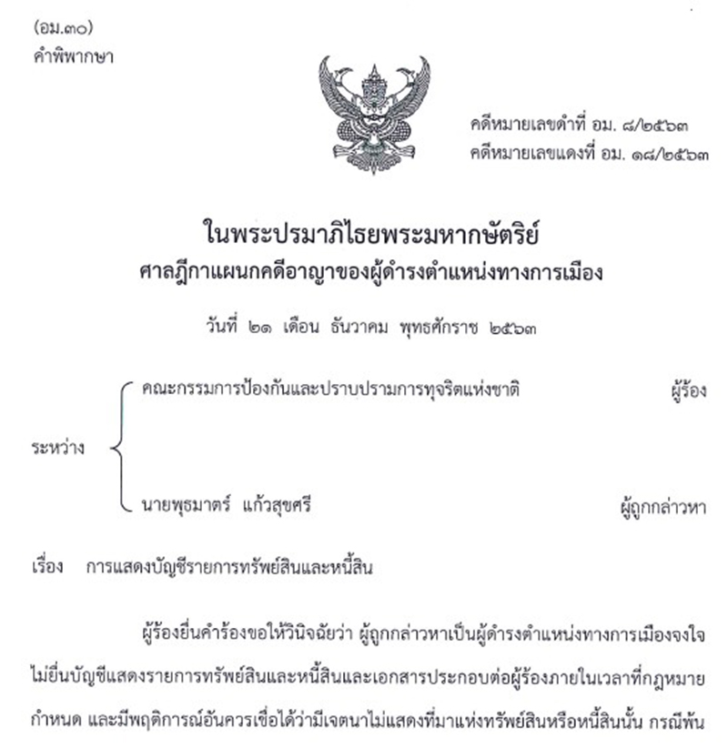 พิพากษาว่า นายพุธมาตร์ แก้วสุขศรี ผู้ถูกกล่าวหา จงใจไม่ยื่นบัญชีแสดงรายการ ทรัพย์สินและหนี้สินและเอกสารประกอบต่อคณะกรรมการ ป.ป.ช. ภายในเวลาที่กฎหมายกําหนด กรณีพ้นจากตําแหน่งรองนายกองค์การบริหารส่วนตําบลควนสุบรรณ อําเภอบ้านนาสาร จังหวัด สุราษฎร์ธานี ตามพระราชบัญญัติประกอบรัฐธรรมนูญว่าด้วยการป้องกันและปราบปรามการทุจริต พ.ศ. 2542 มาตรา 32 และมาตรา 33 ห้ามมิให้ผู้ถูกกล่าวหาดํารงตําแหน่งทางการเมืองหรือดํารงตําแหน่งใดในพรรคการเมืองเป็นเวลาห้าปีนับแต่วันที่ 20 มีนาคม 2561 ซึ่งเป็นวันที่ผู้ถูกกล่าวหาพ้นจากตําแหน่ง ตามพระราชบัญญัติประกอบรัฐธรรมนูญว่าด้วยการป้องกันและปราบปรามการ ทุจริต พ.ศ. 2542 มาตรา 34 วรรคสอง กับมีความผิดตามพระราชบัญญัติประกอบรัฐธรรมนูญว่าด้วยการป้องกันและปราบปรามการทุจริต พ.ศ. 2542 มาตรา 119 องค์คณะเสียงข้างมากให้ จําคุก 2 เดือน และปรับ 8,000 บาท ผู้ถูกกล่าวหาให้การรับสารภาพ เป็นประโยชน์แก่การพิจารณา มีเหตุบรรเทาโทษ ลดโทษให้กึ่งหนึ่งตามประมวลกฎหมายอาญา มาตรา 78 คงจําคุก 1 เดือน และปรับ 4,000 บาท ไม่ปรากฏว่าผู้ถูกกล่าวหาเคยได้รับโทษจําคุกมาก่อน โทษจําคุกจึงให้รอการลงโทษไว้มีกําหนด 1 ปี ตามประมวลกฎหมายอาญา มาตรา 56 ไม่ชําระค่าปรับให้จัดการตามประมวลกฎหมายอาญา มาตรา 29, 30 เนื่องจากคดีนี้ศาลพิพากษารอการลงโทษจําคุก จึงไม่อาจบวกโทษได้ ให้ยกคําขอ (คดีหมายเลขแดงที่ อม.18/2563 –วันที่ 21 ธ.ค.2563)