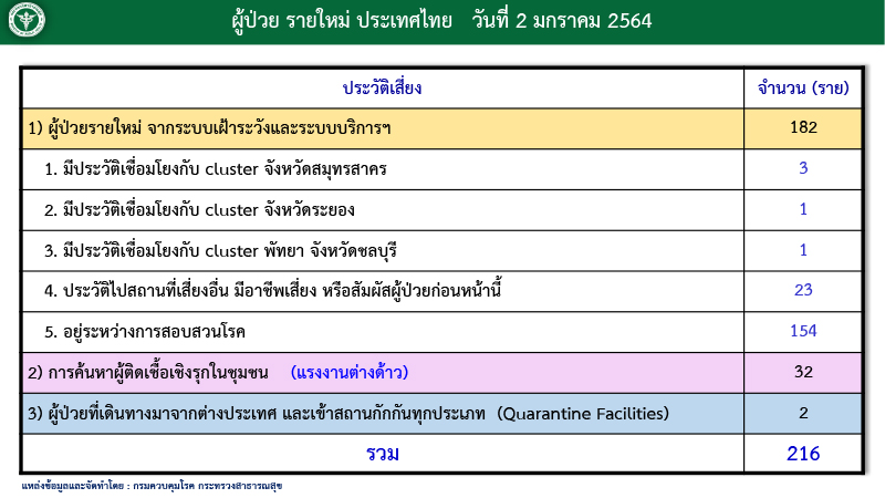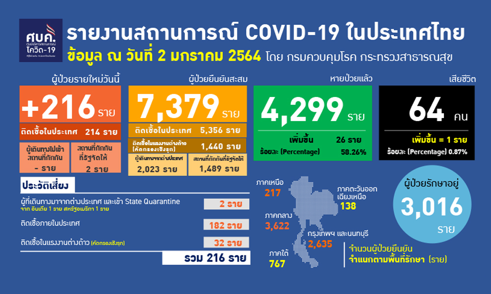 สำนักข่าวอิศรา (www.isranews.org) รายงานว่า เมื่อวันที่ 2 ม.ค.2564 นพ.ทวีศิลป์ วิษณุโยธิน โฆษกศูนย์บริหารสถานการณ์โควิด (ศบค.) แถลงสถานการณ์ประจำวัน โดยพบผู้ป่วยรายใหม่ 216 ราย แบ่งเป็นการติดเชื้อในประเทศ 182 ราย เกิดจากการค้นหาเชิงรุกและพบการติดเชื้อในแรงงานต่างด้าว 32 ราย และอีก 2 รายเดินทางกลับมาจากต่างประเทศ รวมผู้ป่วยสะสม 7,379 ราย หายป่วยเพิ่ม 26 ราย อยู่ระหว่างรักษาตัวในโรงพยาบาล 3,016 ราย และเสียชีวิตเพิ่มขึ้น 1 ราย สะสมรวม 64 ราย