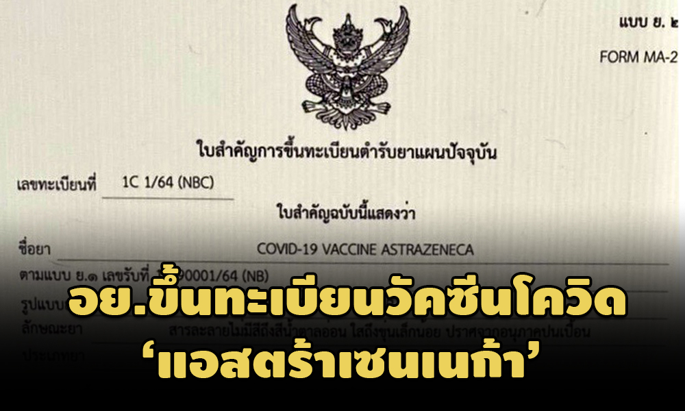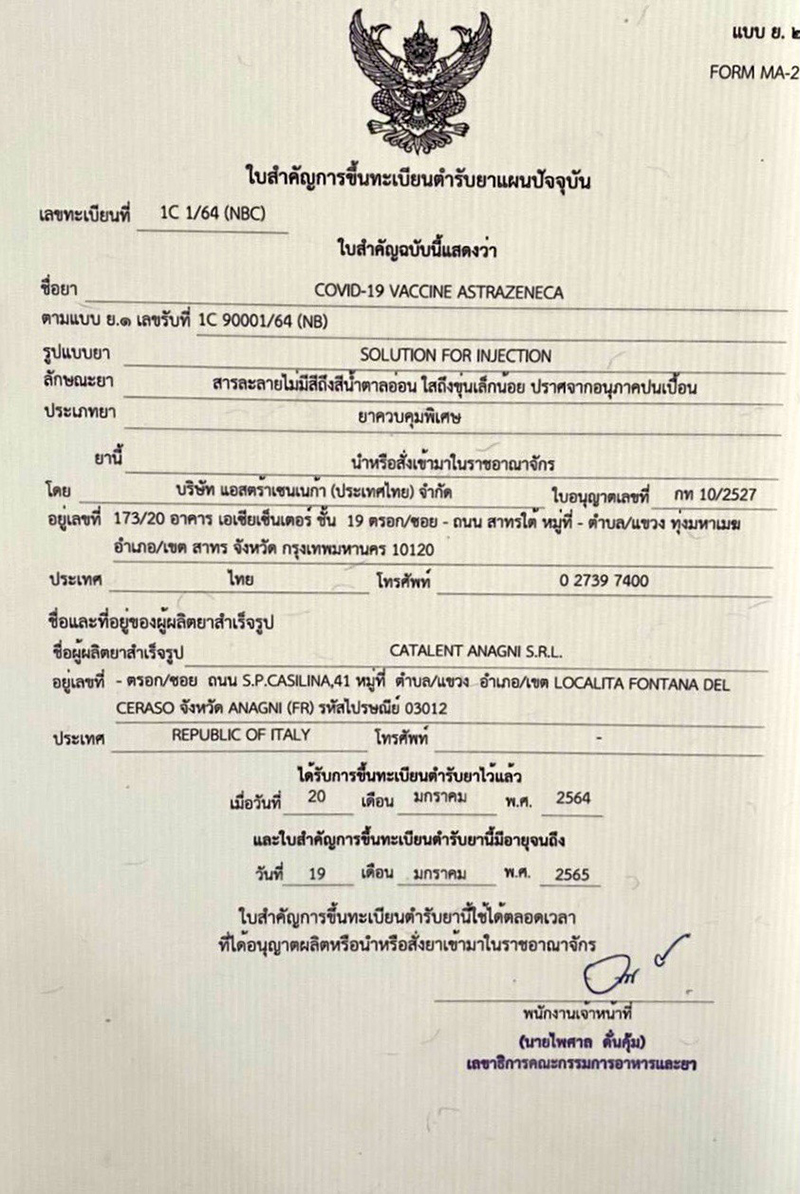 ผู้สื่อข่าวรายงานว่า นายไพศาล ดั่นคุ้ม เลขาธิการคณะกรรมการอาหารและยา ได้ลงนามในใบสำคัญการขึ้นทะเบียนตำรับยาแผนปัจจุบันให้กับวัคซีนโควิด-19 ของบริษัทแอสตร้าเซนเนก้าแล้ว โดยมีชื่อยาตามทะเบียน อย.ว่า COVID-19 VACCINE ASTRAZENECA ประเภทยาควบคุมพิเศษ