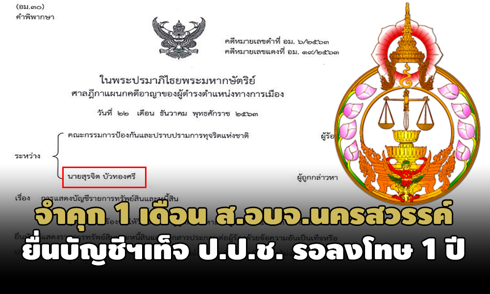 • ศาลฎีกาฯ จําคุก 1 เดือน ให้พ้นตำแห่ง ส.อบจ.นครสวรรค์ ซุกทรัพย์สิน ป.ป.ช. รอลงโทษ 1 ปี