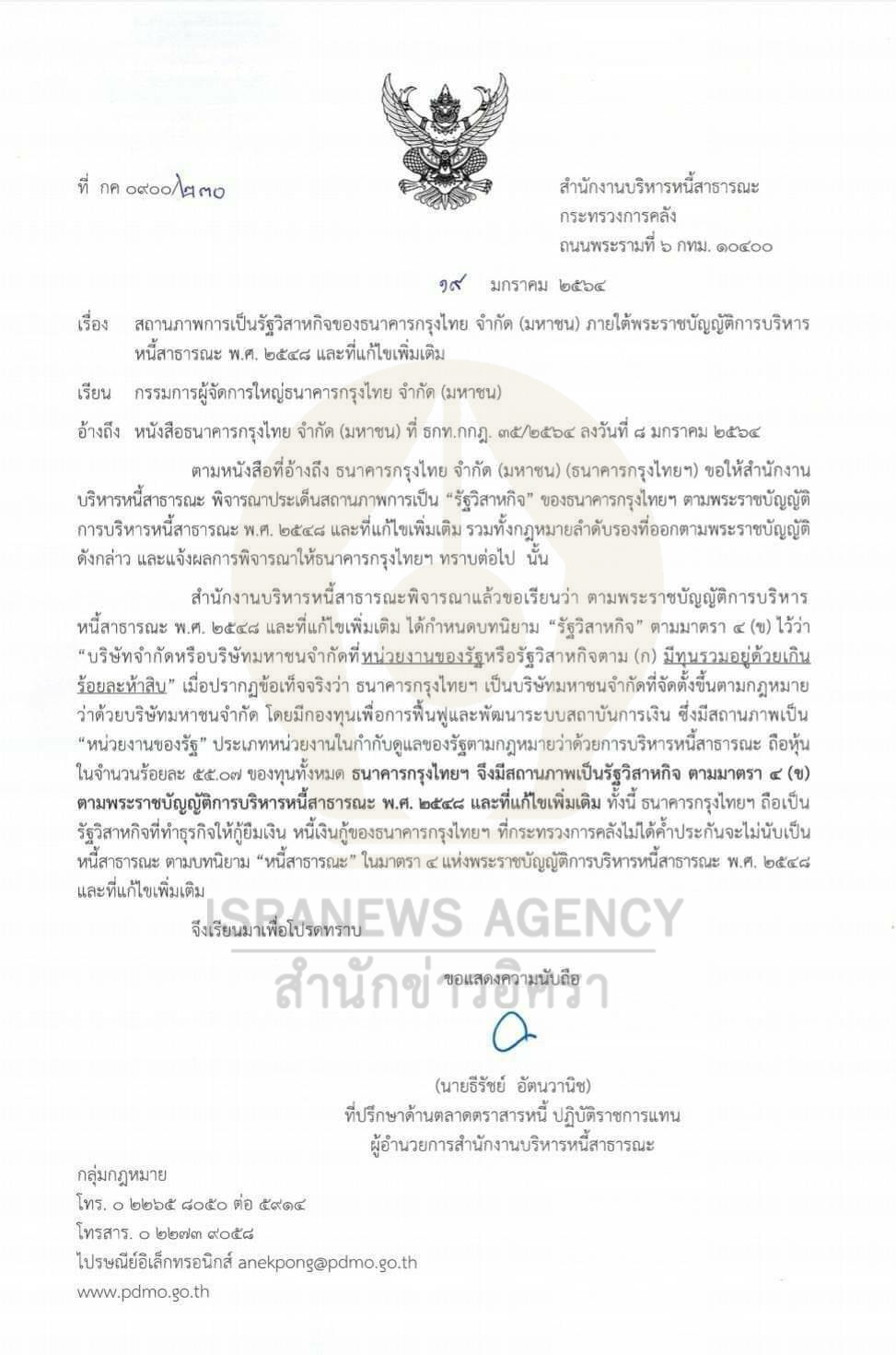 สำนักข่าวอิศรา (www.isranews.org) รายงานว่า เมื่อวันที่ 19 ม.ค.2564 นายธีรัชย์ อัตนวานิช ที่ปรึกษาด้านตลาดตราสารหนี้ ปฏิบัติราชการแทนผู้อำนวยการสำนักงานบริหารหนี้สาธารณะ (สบน.) ลงนามหนังสือที่ กค. 0900/230 เรื่อง สถานภาพการเป็นรัฐวิสาหกิจของธนาคารกรุงไทย จำกัด (มหาชน) ภายใต้พระราชบัญญัติการบริหารหนี้สาธารณะ พ.ศ.2548 และที่แก้ไขเพิ่มเติม โดยมีเนื้อหาว่า