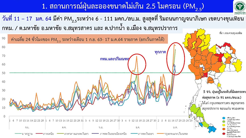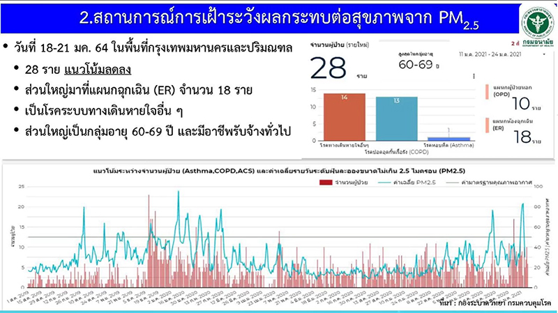สำนักข่าวอิศรา (www.isranews.org) รายงานว่า เมื่อวันที่ 26 ม.ค. 2564 ศูนย์แก้ไขปัญหามลพิษทางอากาศด้านผลกระทบต่อสุขภาพ (ศกพ.ส) จัดการแถลง ปัญหาฝุ่น PM2.5 ที่มีผลกระทบต่อเด็ก ซึ่งมีความเสี่ยงต่อสุขภาพและวิธีป้องกัน ณ ห้องประชุมสมบูรณ์ วัชโรทัย อาคาร 1 ชั้น 2 กรมอนามัย โดย นพ.สุวรรณชัย วัฒนายิ่งเจริญชัย อธิบดีกรมอนามัย เปิดเผยว่า ในช่วงสัปดาห์นี้ฝุ่นละอองขนาดเล็ก PM 2.5 ใน กทม.ดีขึ้น แต่หลายพื้นที่โดยเฉพาะเขตพื้นที่ภาคเหนือ และภาคตะวันออกเฉียงเหนือ เริ่มมีปัญหาฝุ่น PM 2.5 จากการเผาไหม้ บางพื้นที่อยู่ในระดับที่เป็นอันตรายต่อสุขภาพ และมีการคาดการณ์ประมาณวันที่ 27-28 ม.ค.นี้ ในพื้นที่ กทม. จะเริ่มมีปัญหาฝุ่นอีกครั้ง ดังนั้นขอให้ประชาชนตรวจสอบสภาพอากาศ และหลีกเลี่ยงกิจกรรมที่กลางแจ้ง