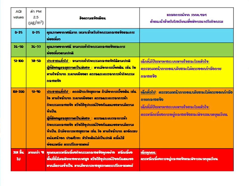 ผศ.พญ.หฤทัย กมลาภรณ์ กุมารแพทย์โรคระบบหายใจ ภาควิชากุมารเวชศาสตร์ คณะแพทยศาสตร์ โรงพยาบาลรามาธิบดี มหาวิทยาลัยมหิดล กล่าวว่า จากข้อมูลของกรมควบคุมมลพิษ แบ่งระดับความรุนแรงทั้งหมด 5 ระดับ ตามลำดับสี คือ ฟ้า เขียว เหลือง ส้ม และแดง พร้อมแนะให้ดูค่าคุณภาพอากาศโดยรวม (AQI) ซึ่งคำนวณจากค่ามลพิษทั้งหมด 6 ชนิด ซึ่งระดับที่อยู่ในอันตรายสำหรับเด็กสุขภาพดีหรือบุคคลทั่วไป ระดับที่เฝ้าระวังคือเมื่อคุณภาพอากาศเกิน 100 (สีส้ม) แต่สำหรับกลุ่มเสี่ยง เช่น เด็กที่มีโรคประจำตัวคือเมื่อคุณภาพอากาศอยู่ในช่วง 51-100 (สีเหลือง) ก็ควรจะเฝ้าระวังแล้ว