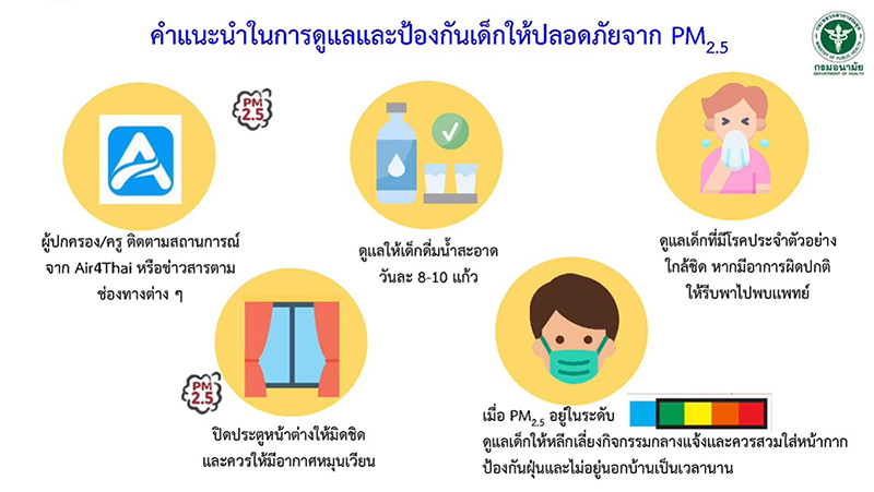 อธิบดีกรมอนามัย กล่าวอีกว่า เด็กคือกลุ่มเปราะบางที่ได้รับผลกระทบต่อสุขภาพจากฝุ่น PM 2.5 องค์การอนามัยโลก (WHO) ประมาณการณ์ว่าทุกปีจะมีเด็กอายุต่ำกว่า 5 ปี เสียชีวิตเนื่องจากการรับสัมผัสมลพิษทางอากาศ ทั้งจากมลพิษทางอากาศในบ้านและในบรรยากาศ กว่า 570,000 คน ฝุ่น pm 2.5 กระทบต่อพัฒนาการทางสมองและประสิทธิภาพการทำงานของปอด รวมถึงกระตุ้นการก่อโรคหอบหืด อีกทั้งเป็นสาเหตุของการเจ็บป่วยด้วยโรคระบบหัวใจ โรคระบบทางเดินหายใจ และมะเร็งในระยะยาว