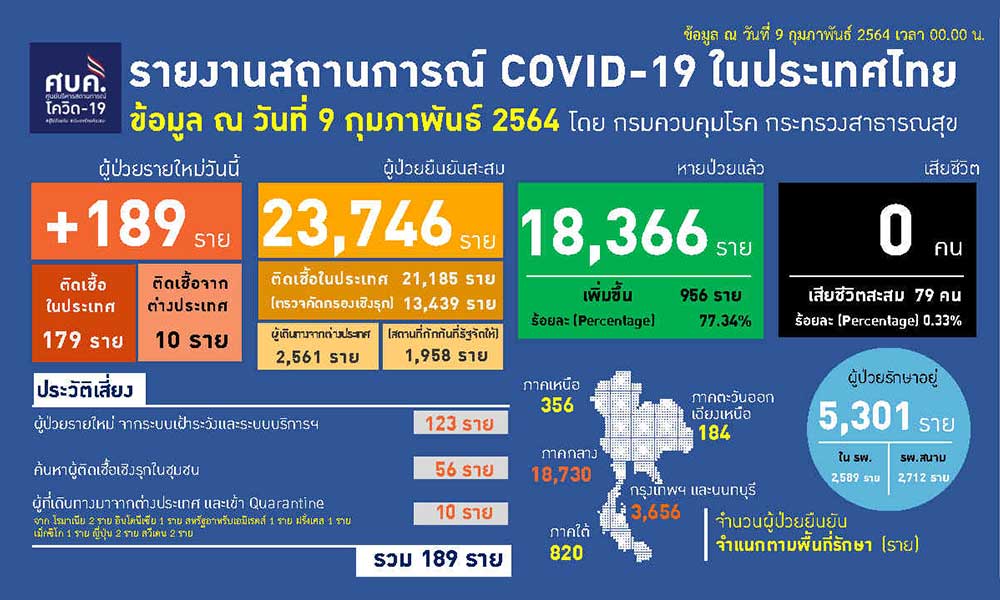 สำนักข่าวอิศรา (www.isranews.org) รายงานว่า เมื่อวันที่ 9 ก.พ. 2564 เวลา 11.30 นพ.ทวีศิลป์ วิษณุโยธิน โฆษกศูนย์บริหารสถานการณ์โควิด (ศบค.) แถลงสถานการณ์ประจำวัน โดยพบผู้ป่วยรายใหม่ 189 ราย แบ่งเป็นการติดเชื้อในประเทศ 179 ราย เกิดจากระบบเฝ้าระวังและระบบริการฯ 123 ราย เกิดจากการค้นหาเชิงรุกและพบการติดเชื้อในชุมชน 56 ราย และอีก 10 รายเดินทางกลับมาจากต่างประเทศ รวมผู้ป่วยสะสม 23,746 ราย หายป่วยเพิ่ม 956 ราย อยู่ระหว่างรักษาตัวในโรงพยาบาล 5,301 ราย และเสียชีวิตสะสม 79 ราย