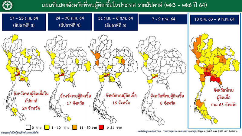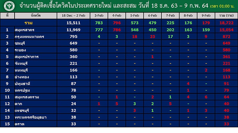 จำนวนผู้ติดเชื้อรายใหม่ 10 จังหวัดสะสมสูงสุด ระหว่างวันที่ 18 ธ.ค.2563 - 9 ก.พ. 2564 ประกอบด้วย สมุทรสาคร 15,054 ราย กทม. 872 ราย ชลบุรี 649 ราย ระยอง 580 ราย สมุทรปราการ 361 ราย จันทบุรี 221 ราย นนทบุรี 168 ราย อ่างทอง 113 ราย ปทุมธานี 91 ราย และนครปฐม 79 ราย