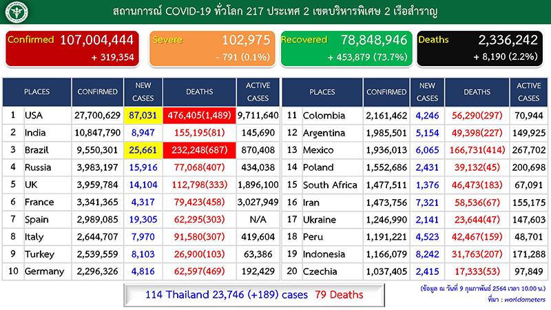 ขณะที่สถานการณ์ทั่วโลกพบผู้ป่วยเพิ่ม 319,354 ราย รวม 107,004,444 ราย อาการหนัก 102,975 ราย หายป่วย 78,848,946 ราย เสียชีวิต 2,336,242 ราย โดยสหรัฐอเมริกาพบผู้ป่วยเพิ่ม 87,031 ราย รวม 27,700,629 ราย เสียชีวิตเพิ่ม 1,489 ราย รวม 276,405ราย อินเดีย เพิ่ม 8,947 ราย รวม 10,847,790 ราย เสียชีวิตเพิ่ม 81 ราย รวม 155,195 ราย บราซิล พบเพิ่ม 25,661 ราย รวม 9,550,301 ราย เสียชีวิตเพิ่ม 687 ราย รวม 232,248 ราย ส่วนไทยอยู่ในอันดับที่ 114 ของโลก
