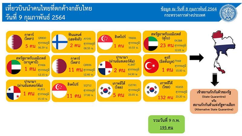 ส่วนกระทรวงการต่างประเทศรายงานว่า วันนี้จะมีคนเดินทางกลับเข้าไทยอีก 195 ราย ประกอบด้วย กาตาร์ 2 เที่ยวบิน 12 ราย สหรัฐอาหรับเอมิเรตส์ 2 เที่ยวบิน 24 ราย ปานามา 2 เที่ยวบิน 2 ราย ฟินแลนด์ 1 เที่ยวบิน 2 ราย สิงคโปร์ 2 เที่ยวบิน 12 ราย เกาหลีใต้ 2 เที่ยวบิน 137 ราย และตุรกี 1 เที่ยวบิน 1 ราย