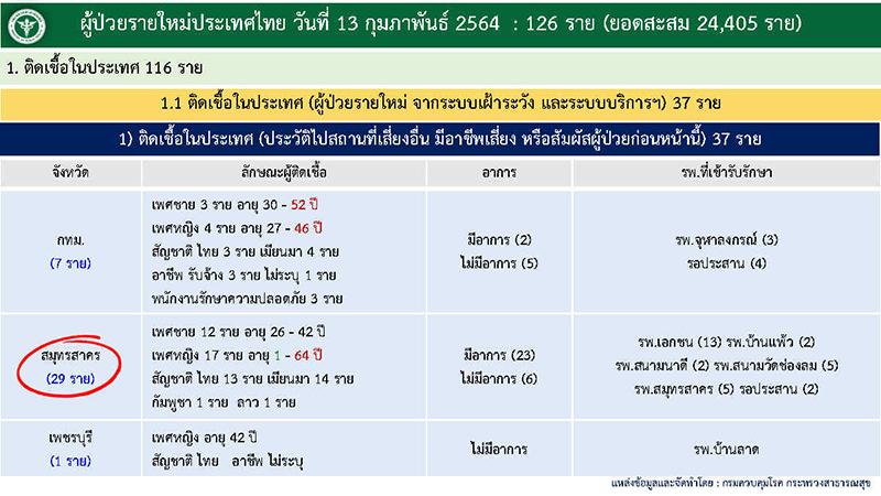 สำหรับผู้ป่วยติดเชื้อในประเทศ 116 ราย กระจายอยู่ในพื้นที่ 63 จังหวัด มีประวัติไปสถานที่เสี่ยงหรือมีอาชีพเสี่ยง 37 ราย ประกอบด้วย กทม. 7 ราย สมุทรสาคร 29 ราย และเพชรบุรี 1 ราย