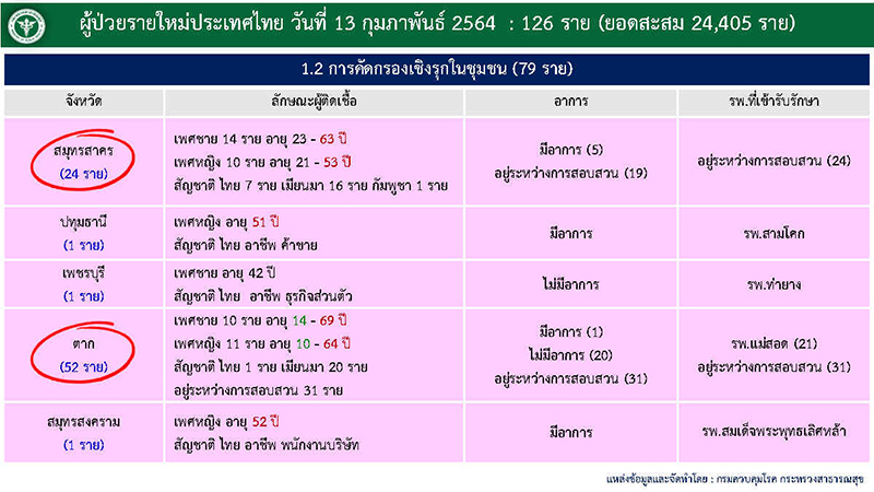 ขณะที่พบผู้ติดเชื้อจากการค้นหาเชิงรุกในชุมชน 79 ราย ราย ประกอบด้วย สมุทรสาคร 24 ราย ปทุมธานี 1 ราย เพชรบุรี 1 ราย ตาก 52 ราย และสมุทรสงคราม 1 ราย