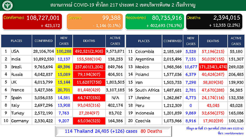 ขณะที่สถานการณ์ทั่วโลกพบผู้ป่วยเพิ่ม 423,172 ราย รวม 108,727,001 ราย อาการหนัก 99,388 ราย หายป่วย 80,735,916 ราย เสียชีวิต 2,394,015 ราย โดยสหรัฐอเมริกาพบผู้ป่วยเพิ่ม 100,288 ราย รวม 28,106,704 ราย เสียชีวิตเพิ่ม 2,908 ราย รวม 492,521 ราย อินเดีย เพิ่ม 12,137 ราย รวม 10,892,550 ราย เสียชีวิตเพิ่ม 104 ราย รวม 155,588 ราย บราซิล พบเพิ่ม 49,396 ราย รวม 9,765,694 ราย เสียชีวิตเพิ่ม 1,204 ราย รวม 237,601 ราย ส่วนไทยอยู่ในอันดับที่ 114 ของโลก