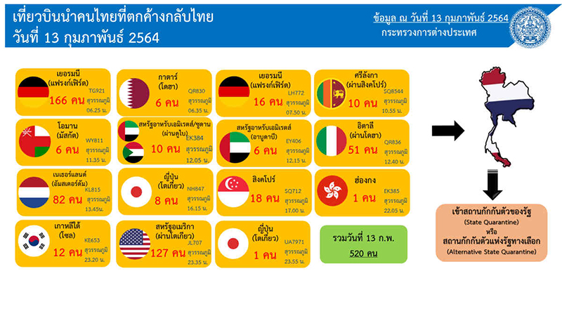 ส่วนกระทรวงการต่างประเทศรายงานว่า วันนี้จะมีคนเดินทางกลับเข้าไทยอีก 520 ราย รวม 15 เที่ยวบิน ประกอบด้วย เยอรมนี 2 เที่ยวบิน 182 ราย โอมาน 1 เที่ยวบิน 6 ราย เนเธอร์แลนด์ 1 เที่ยวบิน 82 ราย เกาหลีใต้ 1 เที่ยวบิน 12 ราย กาตาร์ 1 เที่ยวบิน 6 ราย สหรัฐอาหรับเอมิเรตส์/ซูดาน 2 เที่ยวบิน 16 ราย ญี่ปุ่น 2 เที่ยวบิน 9 ราย สหรัฐอเมริกา 1 เที่ยวบิน 127 ราย สิงคโปร์ 1 เที่ยวบิน 18 ราย ศรีลังกา 1 เที่ยวบิน 10 ราย และฮ่องกง 1 เที่ยวบิน 1 ราย