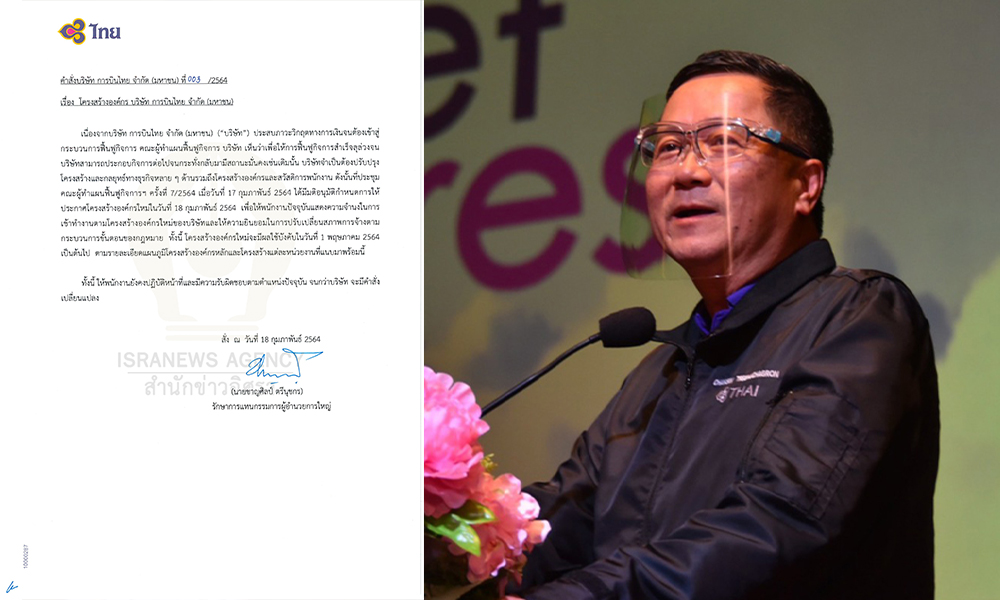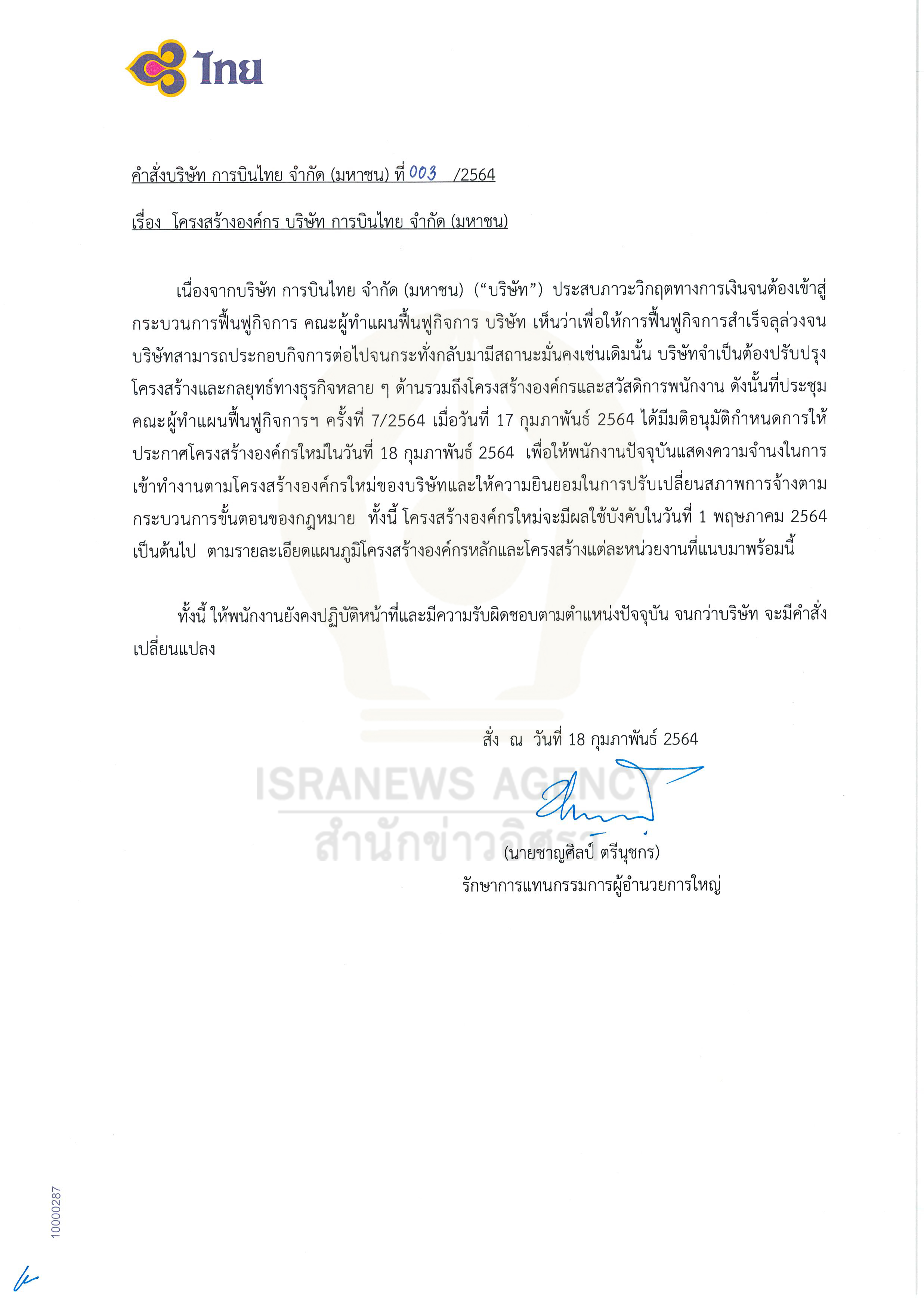 สำนักข่าวอิศรา (www.isranews.org) รายงานว่า เมื่อวันที่ 18 ก.พ.ที่ผ่านมา นายชาญศิลป์ ตรีนุชกร รักษาการแทนกรรมการผู้อำนวยการใหญ่ บริษัท การบินไทย จำกัด (มหาชน) ลงนามคำสั่ง บริษัท การบินไทย จำกัด (มหาชน) ที่ 003/2564 เรื่อง โครงสร้างองค์กร บริษัท การบินไทย จำกัด (มหาชน) เพื่อรองรับแผนฟื้นฟูกิจการ โดยคำสั่งดังกล่าวระบุว่า
