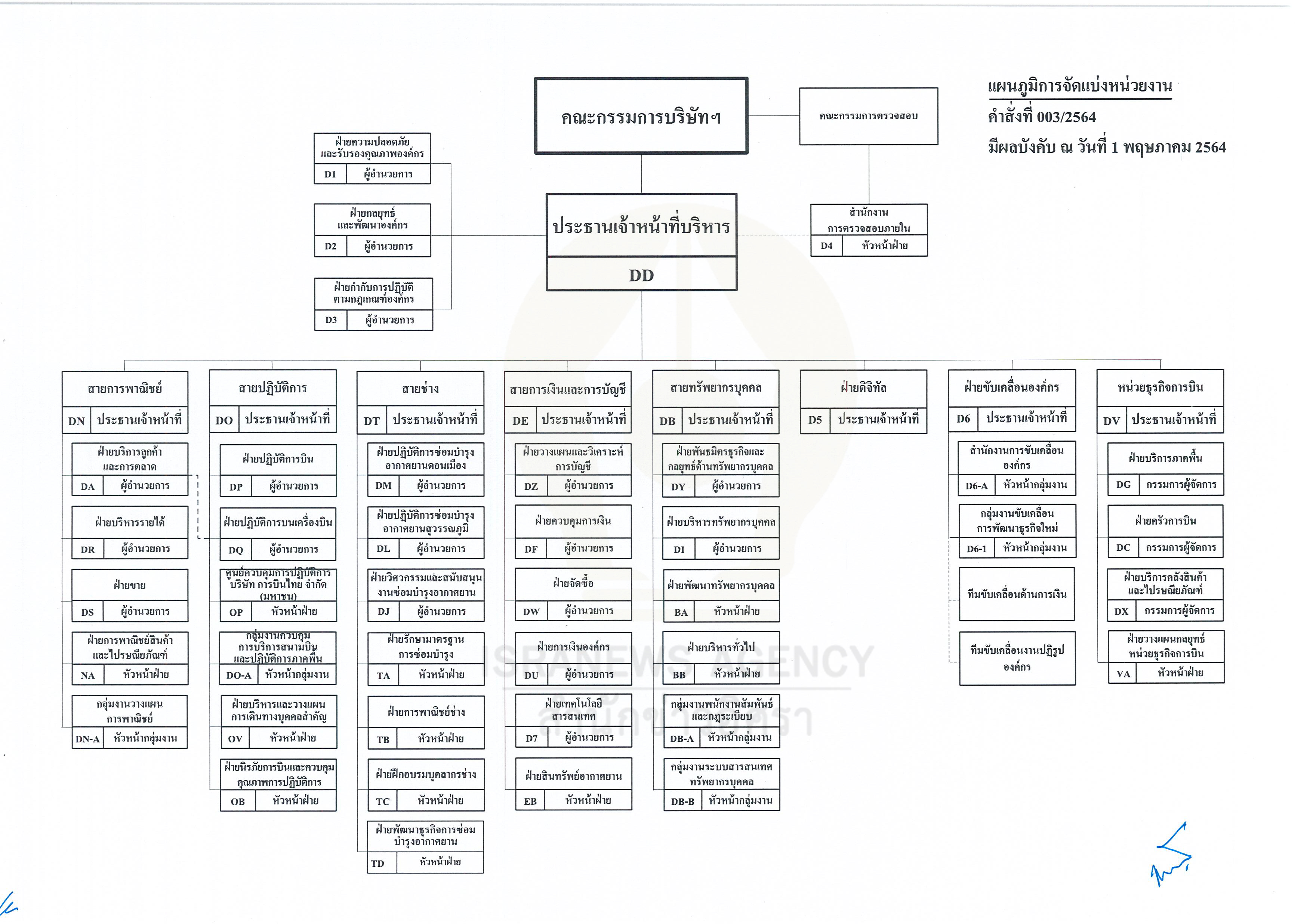 อีกทั้งลดขั้นตอนการบังคับบัญชา จากเดิม 8 ระดับ เหลือ 5 ระดับ ได้แก่ ประธานเจ้าหน้าที่บริหาร (CEO) ระดับ 14 ประธานเจ้าหน้าที่ (Chief of) ระดับ 12-13 ผู้อำนวยการ (Director) และกรรมการผู้จัดการ (Managing Director) ระดับ 11-12 หัวหน้าฝ่าย (Head of) ระดับ 10 และหัวหน้ากลุ่มงาน (Team Lead) ระดับ 8-9 และแบ่งออกเป็น 8 สายงาน ได้แก่ 1.สายการพาณิชย์ 2.สายปฏิบัติการ 3.สายช่าง 4.สายการเงินและการบัญชี 5.สายทรัพยากรบุคคล 6.ฝ่ายดิจิทัล 7.ฝ่ายขับเคลื่อนองค์กร 8.หน่วยธุรกิจการบิน