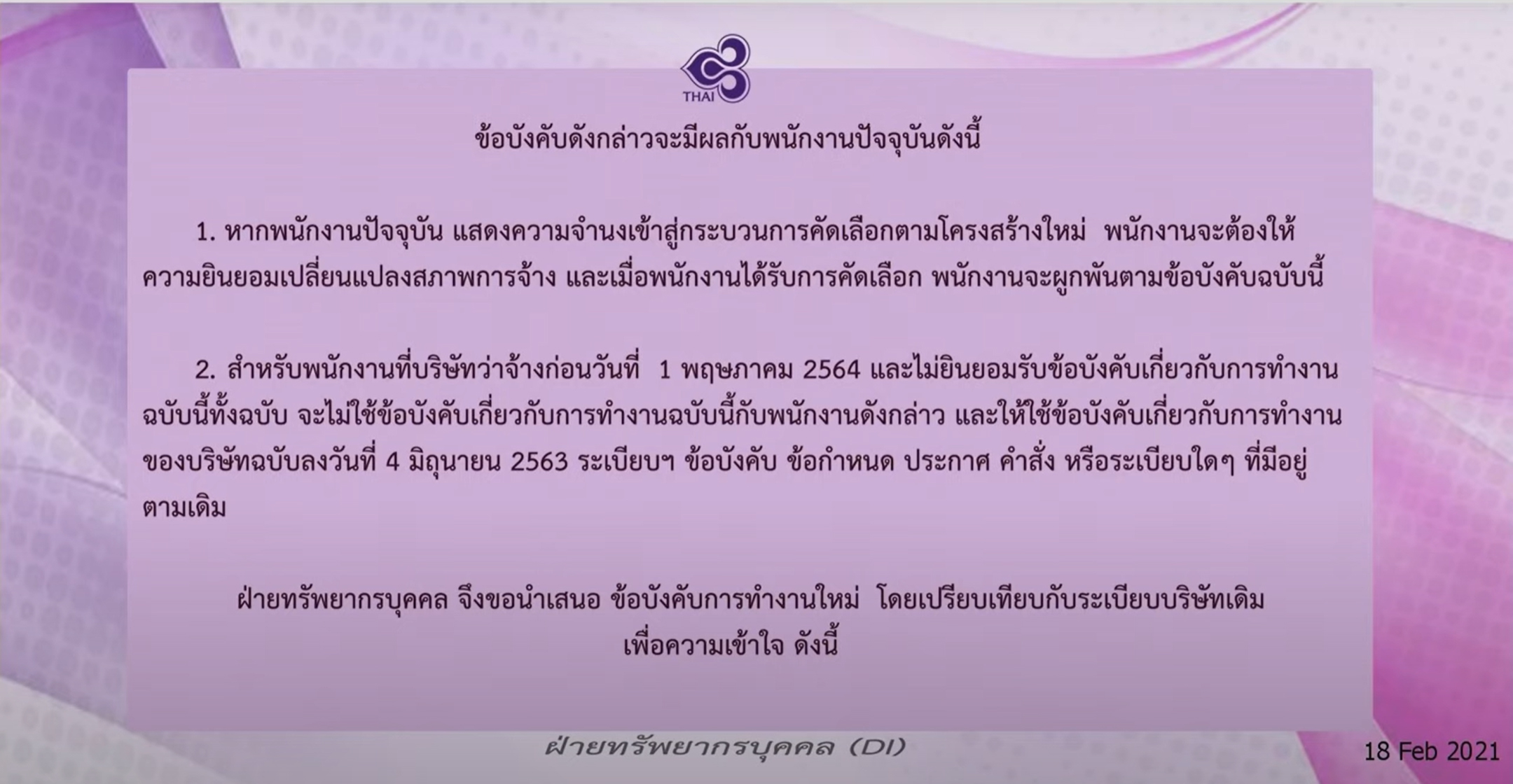 ดังนั้น ที่ประชุมคณะผู้ทำแผนพื้นฟูกิจการฯ ครั้งที่ 7/2564 เมื่อวันที่ 17 ก.พ.2564 ได้มีมติอนุมัติกำหนดการให้ประกาศโครงสร้างองค์กรใหม่ในวันที่ 18 ก.พ.2564 เพื่อให้พนักงานปัจจุบันแสดงความจำนงในการเข้าทำงานตามโครงสร้างองค์กรใหม่ของบริษัท และให้ความยินยอมในการปรับเปลี่ยนสภาพการจ้างตามกระบวนการขั้นตอนของกฎหมาย ทั้งนี้ โครงสร้างองค์กรใหม่จะมีผลใช้บังคับในวันที่ 1 พ.ค.2564 เป็นต้นไป