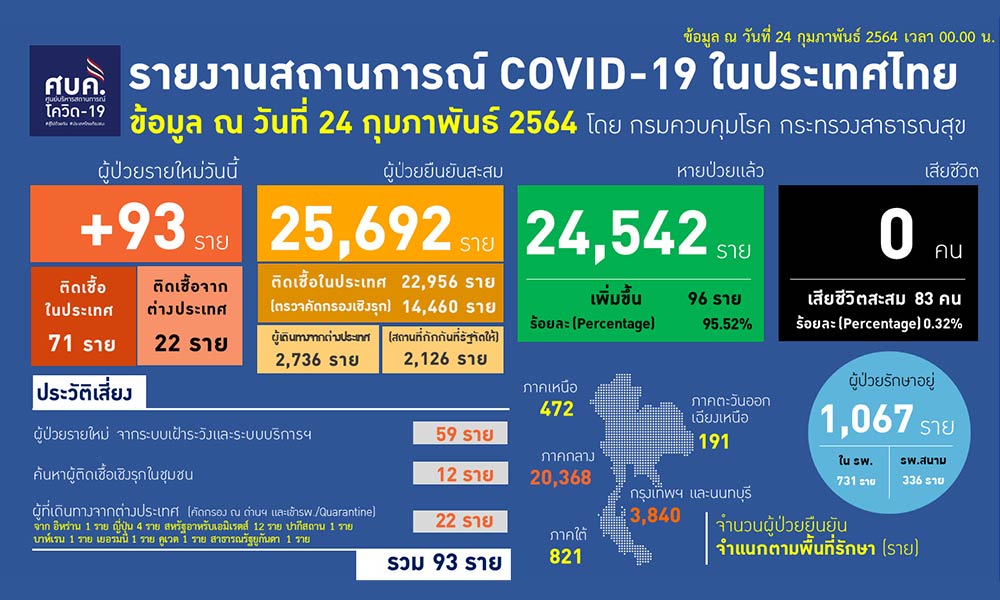 สำนักข่าวอิศรา (www.isranews.org) รายงานว่า เมื่อวันที่ 24 ก.พ. 2564 ศูนย์บริหารสถานการณ์โควิด (ศบค.) เปิดเผยสถานการณ์ประจำวัน พบผู้ป่วยรายใหม่ 93 ราย แบ่งเป็นการติดเชื้อในประเทศ 71 ราย เกิดจากระบบเฝ้าระวังและระบบริการฯ 59 ราย เกิดจากการค้นหาเชิงรุกและพบการติดเชื้อในชุมชน 12 ราย และอีก 22 รายเดินทางกลับมาจากต่างประเทศ รวมผู้ป่วยสะสม 25,692 ราย หายป่วยเพิ่ม 96 ราย อยู่ระหว่างรักษาตัวในโรงพยาบาล 1,067 ราย และเสียชีวิตสะสม 83 ราย