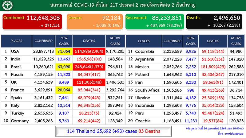 ขณะที่สถานการณ์ทั่วโลกพบผู้ป่วยเพิ่ม 371,151 ราย รวม 112,648,308 ราย อาการหนัก 92,184 ราย หายป่วย 88,233,851 ราย เสียชีวิต 2,496,650 ราย โดยสหรัฐอเมริกาพบผู้ป่วยเพิ่ม 71,064 ราย รวม 28,897,718 ราย เสียชีวิตเพิ่ม 2,404 ราย รวม 514,996 ราย อินเดีย เพิ่ม 13,463 ราย รวม 11,029,326 ราย เสียชีวิตเพิ่ม 100 ราย รวม 156,598 ราย บราซิล พบเพิ่ม 63,090 ราย รวม 10,260,621 ราย เสียชีวิตเพิ่ม 1,370 ราย รวม 248,646 ราย ส่วนไทยอยู่ในอันดับที่ 114 ของโลก