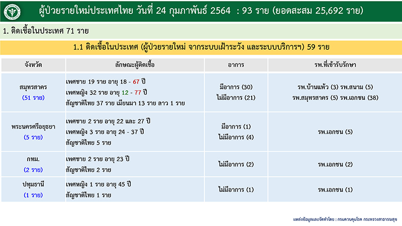 สำหรับผู้ป่วยติดเชื้อในประเทศ 71 ราย กระจายอยู่ในพื้นที่ 63 จังหวัด มีประวัติไปสถานที่เสี่ยงหรือมีอาชีพเสี่ยง 59 ราย ประกอบด้วย สมุทรสาคร 51 ราย พระนครศรีอยุธยา 5 ราย กทม. 2 ราย และปทุมธานี 1 ราย