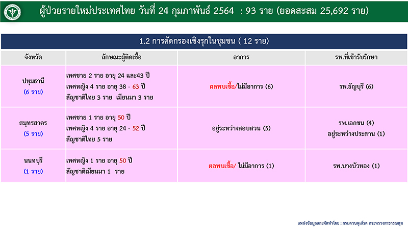 ขณะที่พบผู้ติดเชื้อจากการค้นหาเชิงรุกในชุมชน 12 ราย ราย ประกอบด้วย ปทุมธานี 6 ราย สมุทรสาคร 5 ราย และนนทบุรี 1 ราย