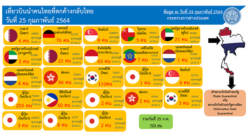 ส่วนกระทรวงการต่างประเทศรายงานว่า วันนี้จะมีคนเดินทางกลับเข้าไทยอีก 703 ราย รวม 23 เที่ยวบิน ประกอบด้วย กาตาร์ 2 เที่ยวบิน 27 ราย สหรัญอาหรับเอมิเรตส์ 2 เที่ยวบิน 24 ราย เนเธอร์แลนด์ 2 เที่ยวบิน 5 ราย ญี่ปุ่น 6 เที่ยวบิน 222 ราย เยอรมนี 1 เที่ยวบิน 76 ราย ฮ่องกง 2 เที่ยวบิน 88 ราย ฟิลิปปินส์ 1 เที่ยวบิน 60 ราย สิงคโปร์ 2 เที่ยวบิน 14 ราย อินโดนีเซีย 1 เที่ยวบิน 63 ราย เกาหลรใต้ 1 เที่ยวบิน 110 ราย โอมาน 1 เที่ยวบิน 5 ราย และเอธิโอเปีย 1 เที่ยวบิน 7 ราย