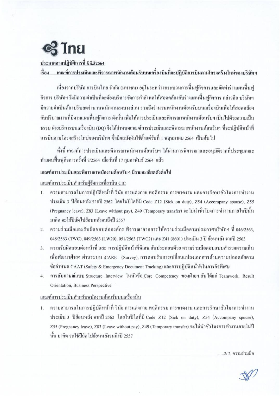 สำนักข่าวอิศรารายงานเพิ่มเติมว่า เมื่อวันที่ 1 มี.ค. น.ต.อนิรุต แสงฤทธิ์ รองกรรมการผู้อำนวยการใหญ่สายปฏิบัติการ บริษัท การบินไทย จำกัด (มหาชน) ลงนามประกาศฝ่ายปฏิบัติการที่ 003/2564 เรื่อง เกณฑ์การประเมินและและพิจารณาพนักงานต้อนรับบนเครื่องบินที่จะปฏิบัติการบินตามโครงสร้างใหม่ของบริษัทฯ โดยหลักเกณฑ์ดังกล่าวผ่านการพิจารณาอนุมัติจากที่ประชุมคณะผู้ทำแผนฟื้นฟูกิจการฯเมื่อวันที่ 17 ก.พ.2564 แล้ว
