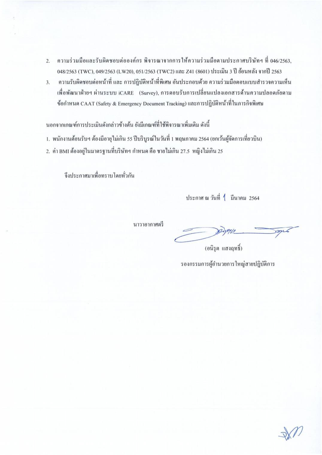 นอกจากนี้ ยังมีการกำหนดเกณฑ์ประเมินเพิ่มเติมอีก 2 ข้อ ได้แก่ 1.พนักงานต้อนรับฯ ต้องมีอายุไม่เกิน 55 ปีบริบูรณ์ในวันที่ 1 พ.ค.2564 (ยกเว้นผู้จัดการเที่ยวบิน) และ2.ดัชนีมวลกาย (BMI หรือ ค่าความหนาของร่างกาย ซึ่งใช้ในการประเมินภาวะอ้วนหรือผอมในผู้ใหญ่ตั้งแต่อายุ 20 ปีขึ้นไป) ต้องอยู่ในมาตรฐานที่บริษัทฯ กำหนด คือ ชายไม่เกิน 27.5 หญิงไม่เกิน 25