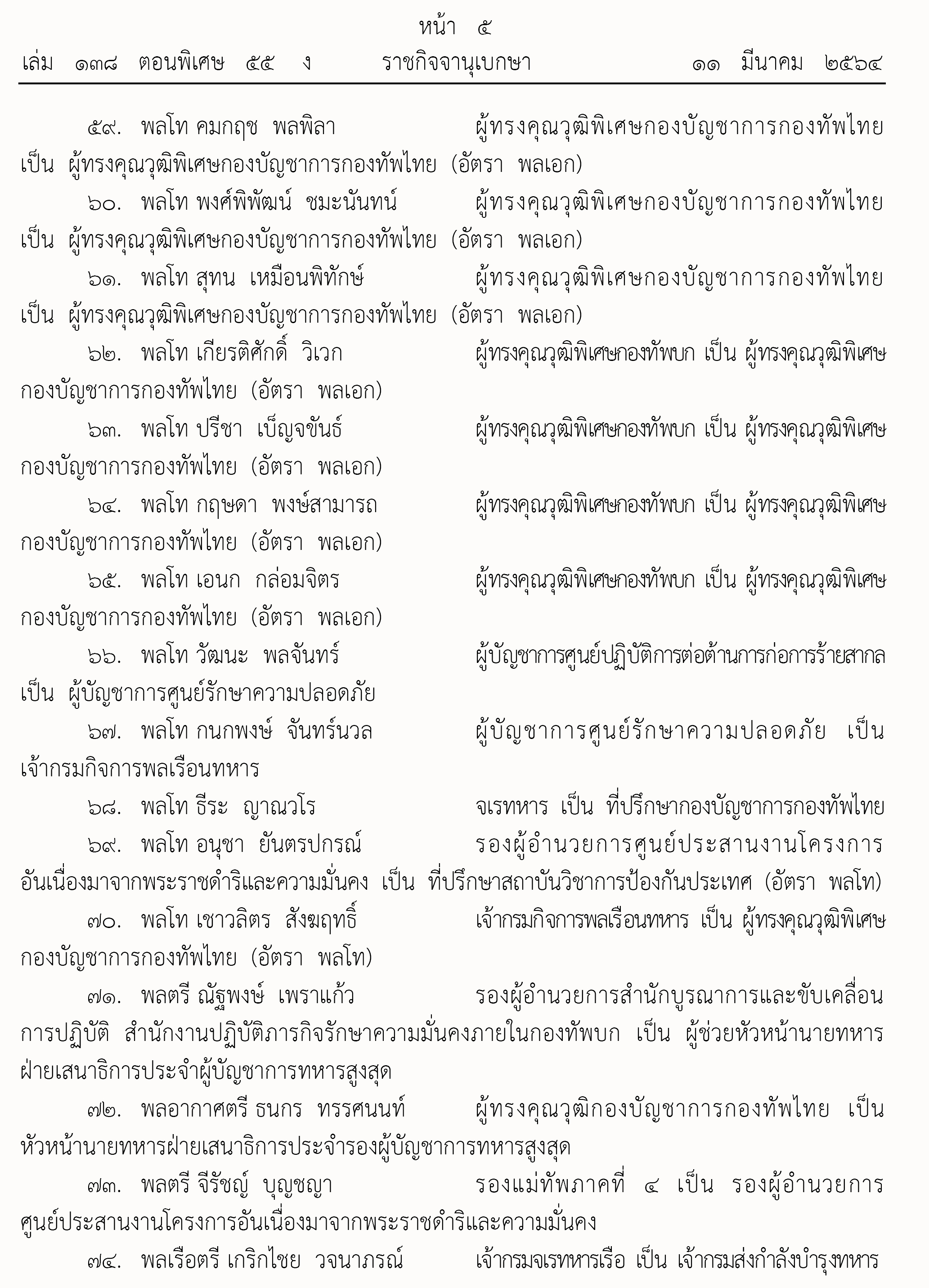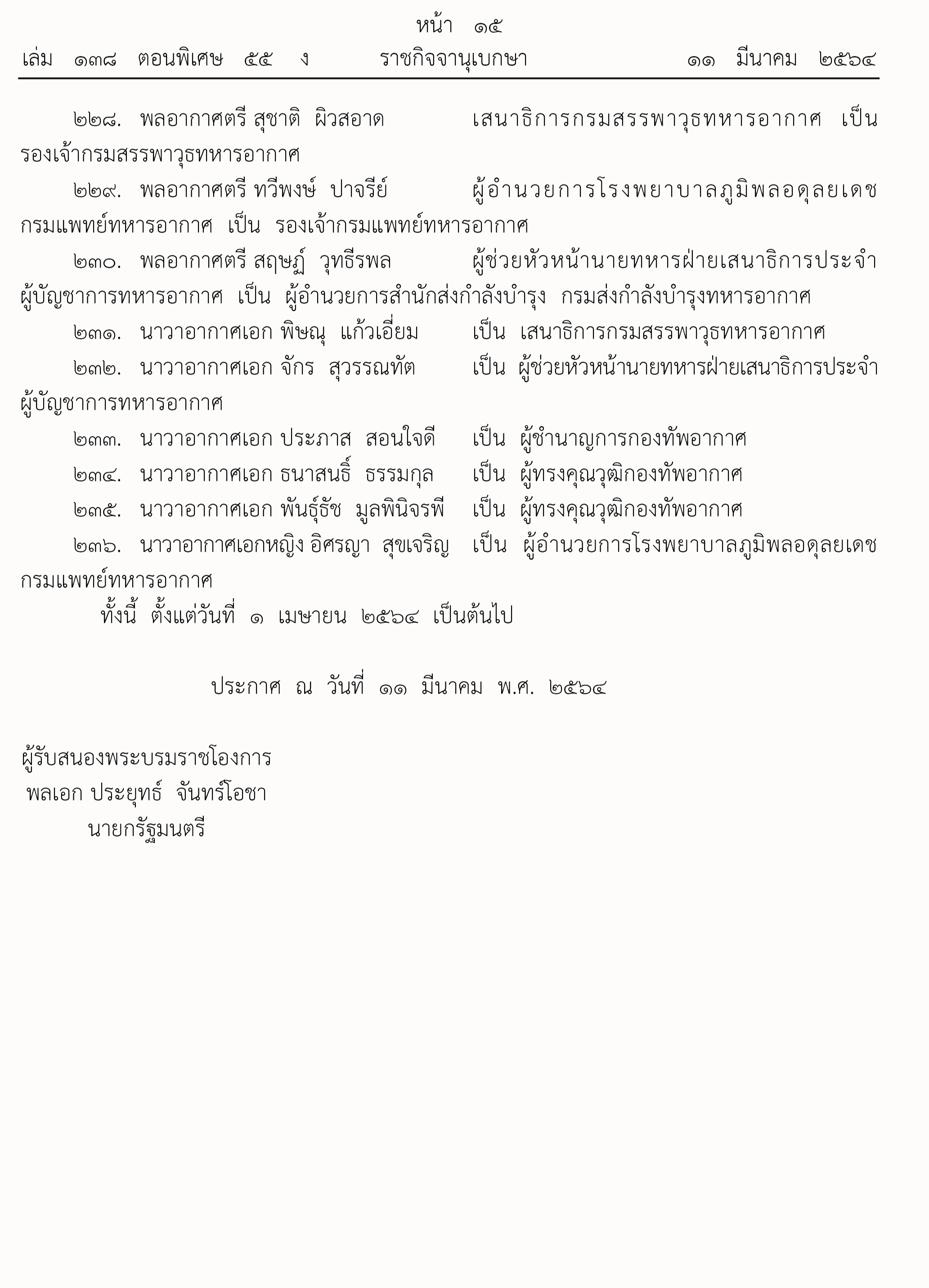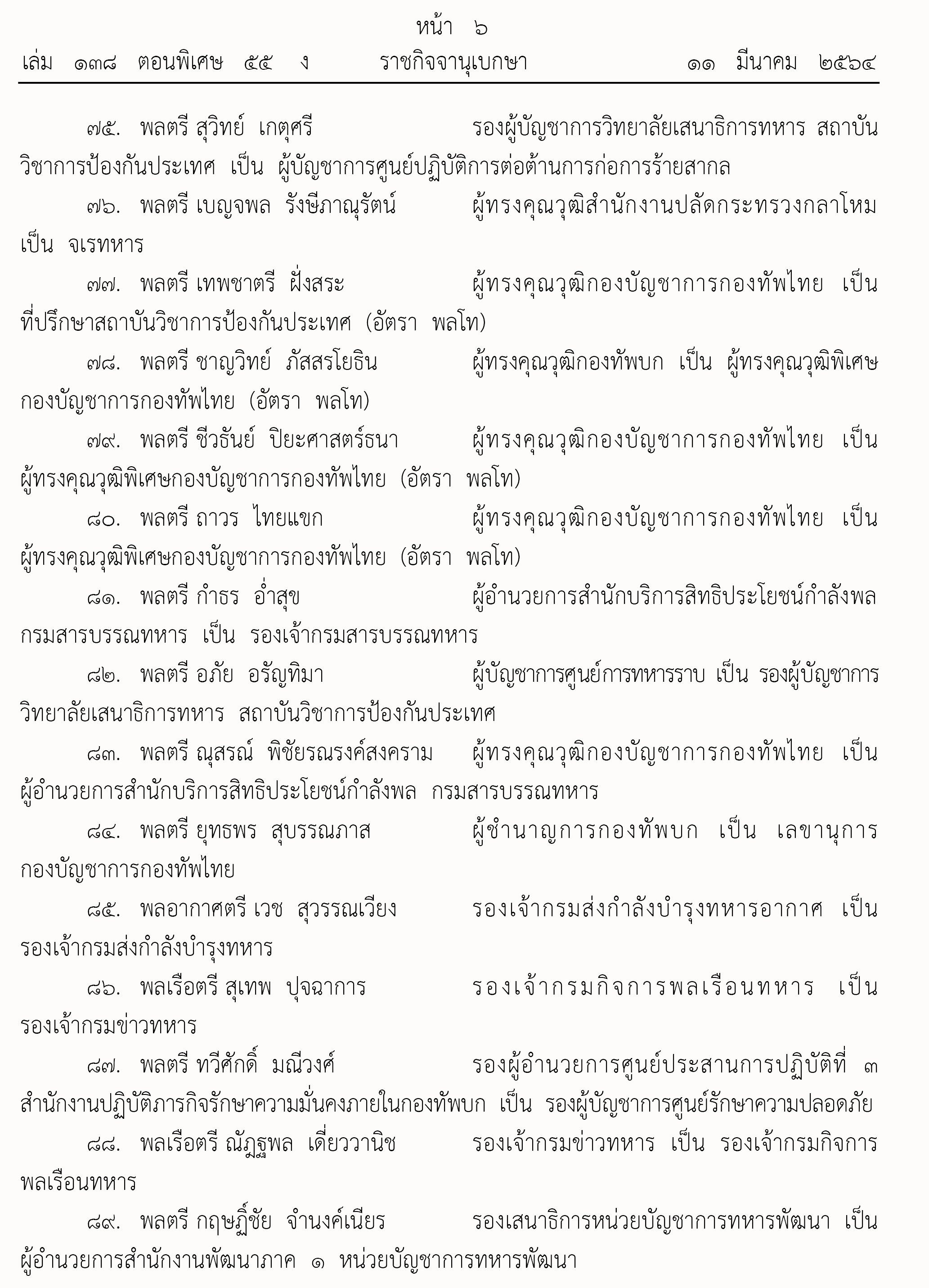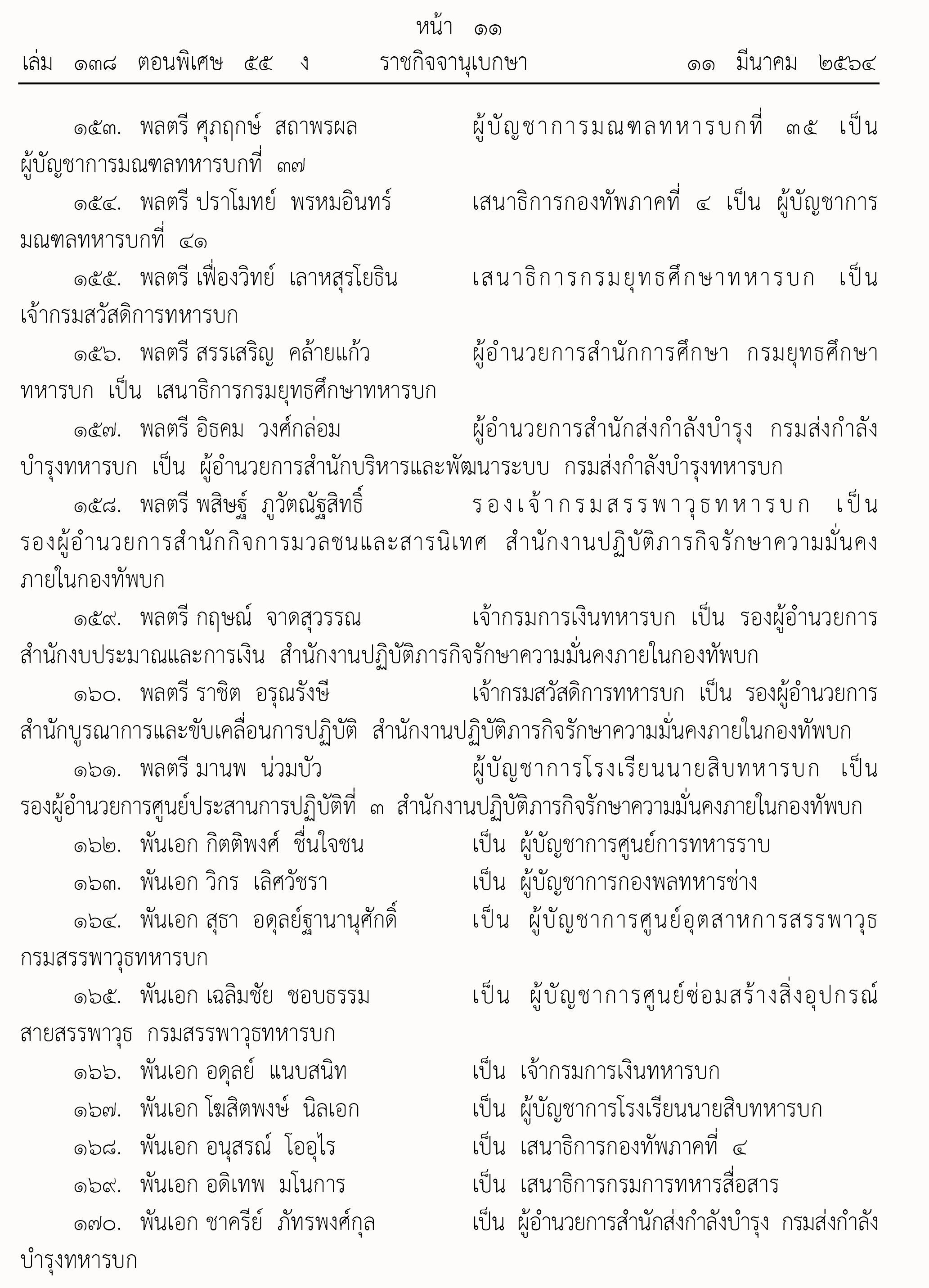 เว็บไซต์ราชกิจจานุเบกษา เผยแพร่ ประกาศสำนักนายกรัฐมนตรี เรื่องให้นายทหารรับราชการ ความว่ามีพระบรมราชโองการโปรดเกล้าโปรดกระหม่อมให้นายทหารรับราชการสนองพระเดชพระคุณ จำนวน 236 นาย
