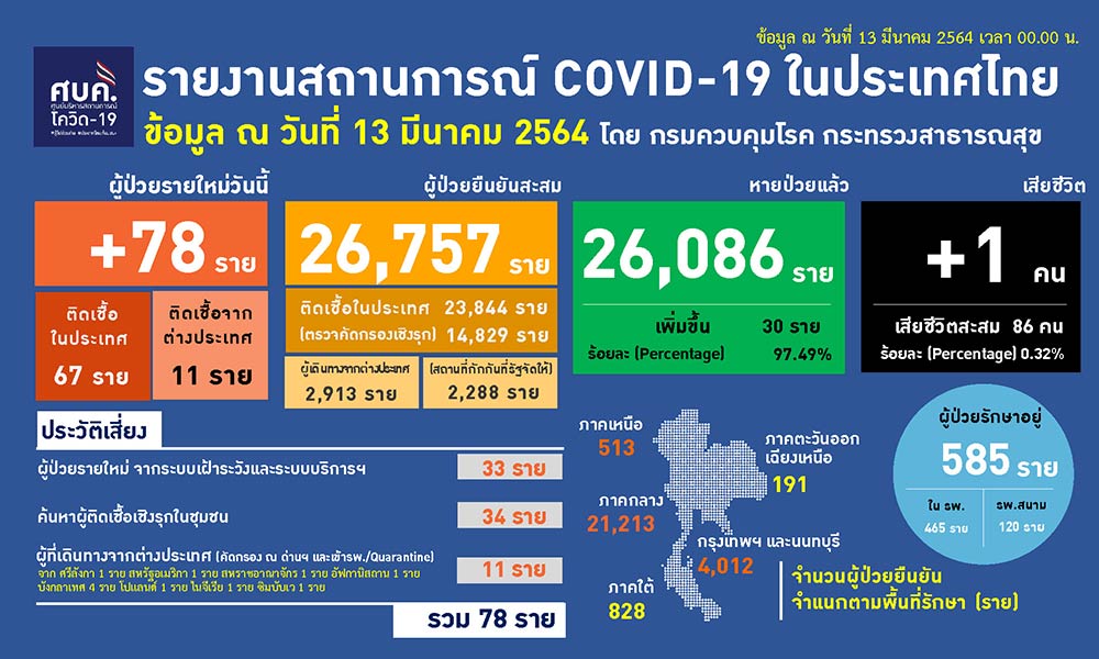 สำนักข่าวอิศรา (www.isranews.org) รายงานว่า เมื่อวันที่ 13 มี.ค.2564 ศูนย์บริหารสถานการณ์โควิด (ศบค.) เปิดเผยสถานการณ์ประจำวัน พบผู้ป่วยรายใหม่ 78 ราย แบ่งเป็นการติดเชื้อในประเทศ 67 ราย เกิดจากระบบเฝ้าระวังและระบบริการฯ 33 ราย เกิดจากการค้นหาเชิงรุกและพบการติดเชื้อในชุมชน 34 ราย และอีก 11 รายเดินทางกลับมาจากต่างประเทศ รวมผู้ป่วยสะสม 26,757 ราย หายป่วยเพิ่ม 30 ราย อยู่ระหว่างรักษาตัวในโรงพยาบาล 585 ราย และเสียชีวิต 1 ราย รวมเสียชีวิตสะสม 86 ราย