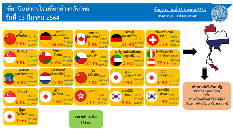 ส่วนกระทรวงการต่างประเทศรายงานว่า วันนี้จะมีคนเดินทางกลับเข้าไทยอีก 396 ราย รวม 21 เที่ยวบิน ประกอบด้วย จีน 2 เที่ยวบิน 4 ราย สิงคโปร์ 2 เที่ยวบิน 10 ราย เอธิโอเปีย 1 เที่ยวบิน 3 ราย ญี่ปุ่น 4 เที่ยวบิน 6 ราย เยอรมนี 2 เที่ยวบิน 175 ราย โอมาน 1 เที่ยวบิน 6 ราย เนเธอร์แลนด์ 1 เที่ยวบิน 75 ราย แคนาดา 1 เที่ยวบิน 5 ราย เช็ก 1 เที่ยวบิน 27 ราย ฮ่องกง 1 เที่ยวบิน 1 ราย สหรัฐอาหรับเอมิเรตส์ 1 เที่ยวบิน 3 ราย เกาหลีใต้ 2 เที่ยวบิน 8 ราย สวิตเซอร์แลนด์ 1 เที่ยวบิน 1 ราย และอิตาลี/ออสเตรีย 1 เที่ยวบิน 72 ราย