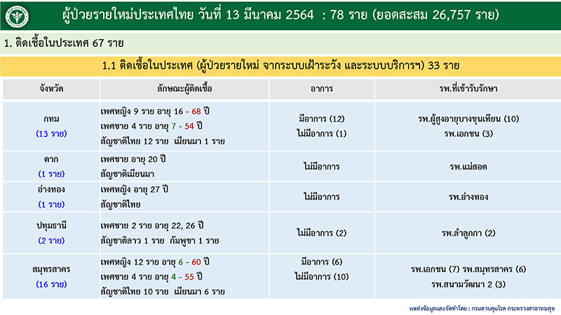 ทั้งนี้มีผู้ป่วยติดเชื้อในประเทศ 67 ราย กระจายอยู่ในพื้นที่ 63 จังหวัด มีประวัติไปสถานที่เสี่ยงหรือมีอาชีพเสี่ยง 33 ราย ประกอบด้วย กทม. 13 ราย ตาก 1 ราย อ่างทอง 1 ราย ปทุมธานี 2 ราย และสมุทรสาคร 16 ราย