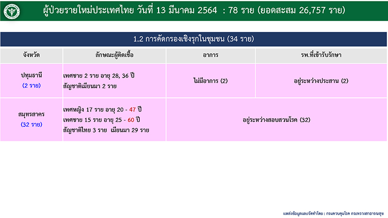 ขณะที่พบผู้ติดเชื้อจากการค้นหาเชิงรุกในชุมชน 34 ราย ราย ประกอบด้วย ปทุมธานี 2 ราย และสมุทรสาคร 32 ราย