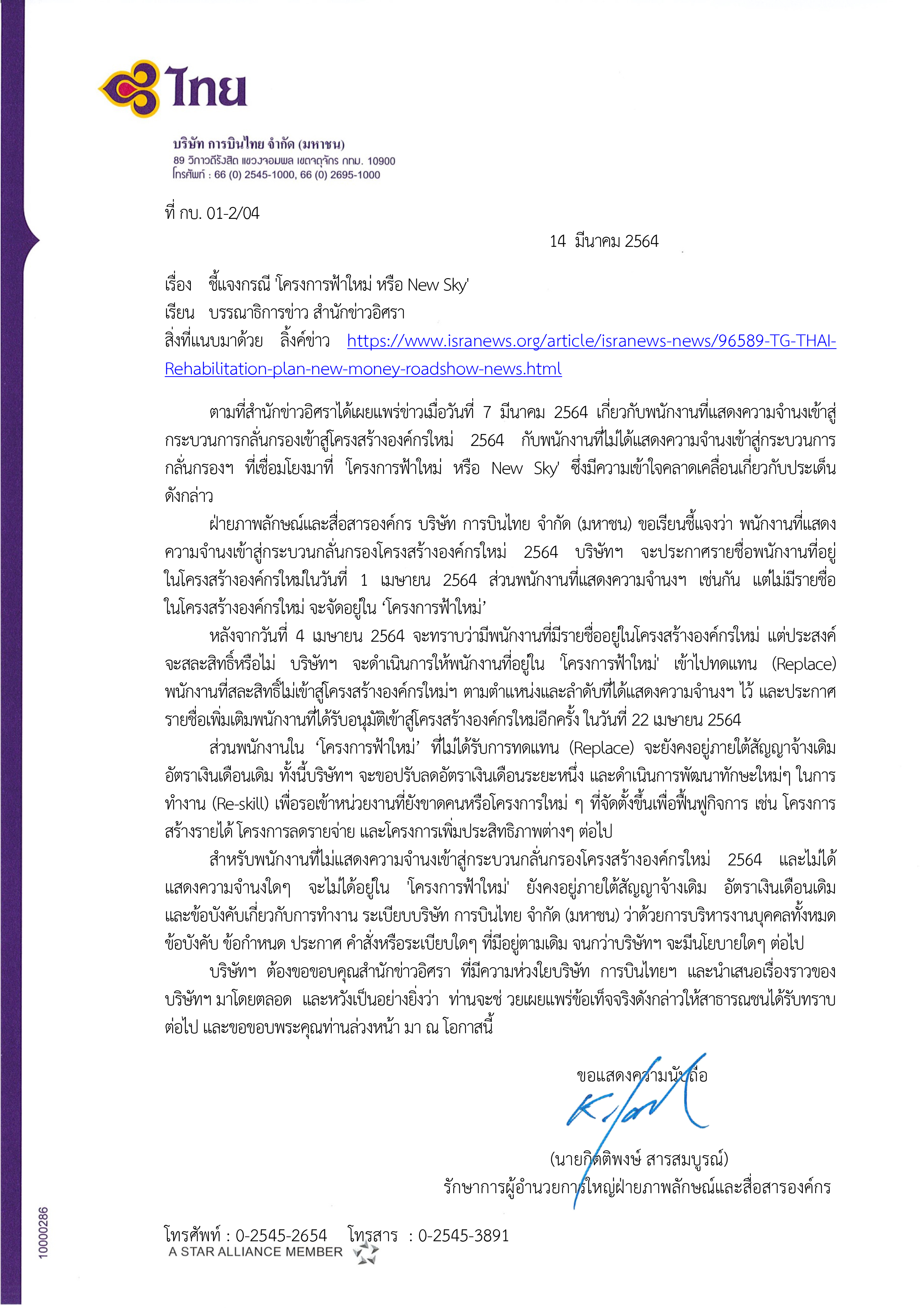ด้านนายกิตติพงษ์ สารสมบูรณ์ รักษาการผู้อำนวยการใหญ่ฝ่ายภาพลักษณ์และสื่อสารองค์กร บริษัท การบินไทย ทำหนังสือชี้แจงสำนักข่าวอิศรากรณี ‘โครงการฟ้าใหม่ หรือ New Sky’ ว่า ฝ่ายภาพลักษณ์และสื่อสารองค์กรฯ ขอชี้แจงว่า พนักงานที่แสดงความจำนงเข้าสู่กระบวนกลั่นกรองโครงสร้างองค์กรใหม่ 2564 บริษัทฯ จะประกาศรายชื่อพนักงานที่อยู่ในโครงสร้างองค์กรใหม่ในวันที่ 1 เม.ย.2564 ส่วนพนักงานที่แสดงความจำนงฯเช่นกัน แต่ไม่มีรายชื่อในโครงสร้างองค์กรใหม่จะจัดอยู่ใน ‘โครงการฟ้าใหม่’