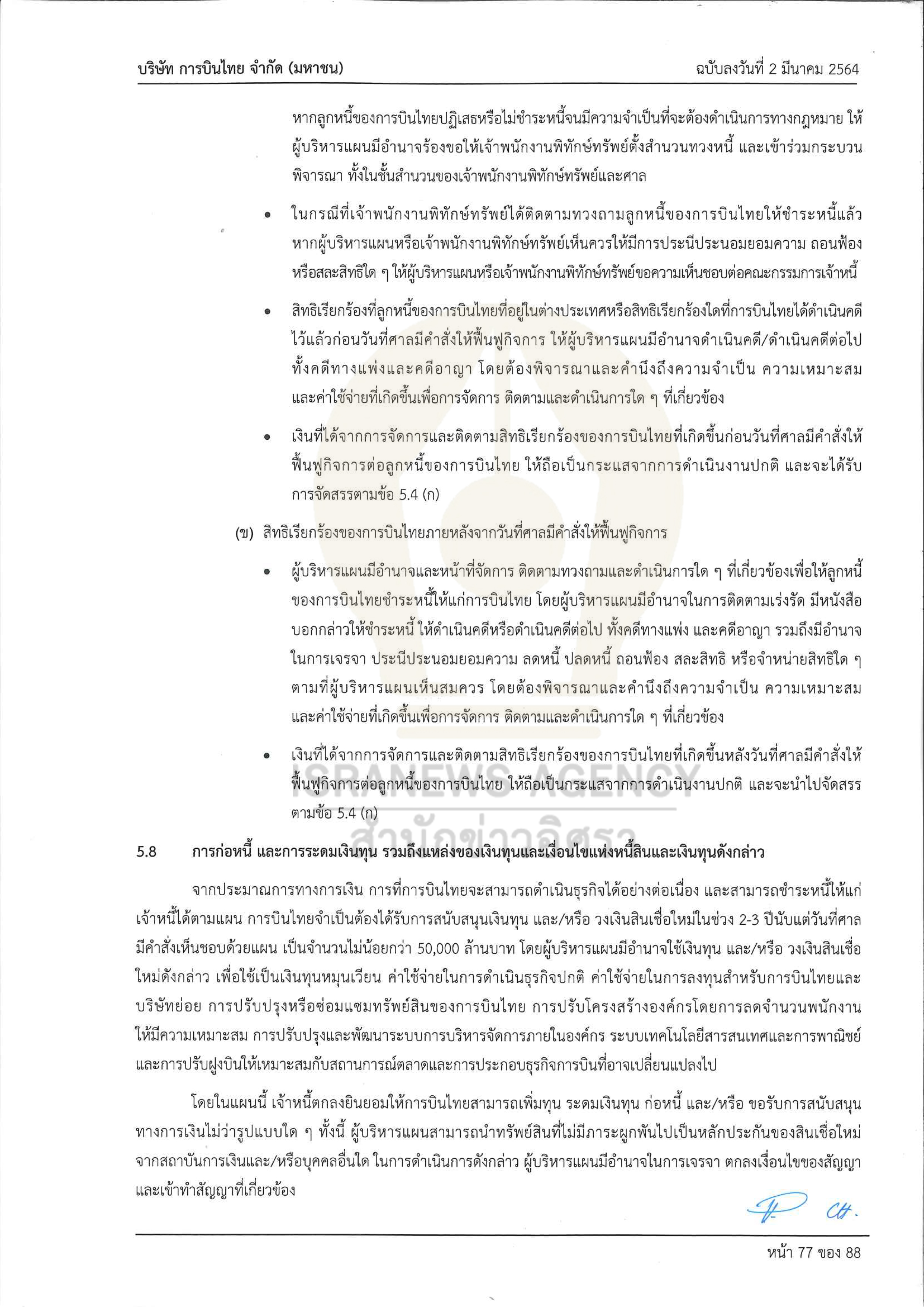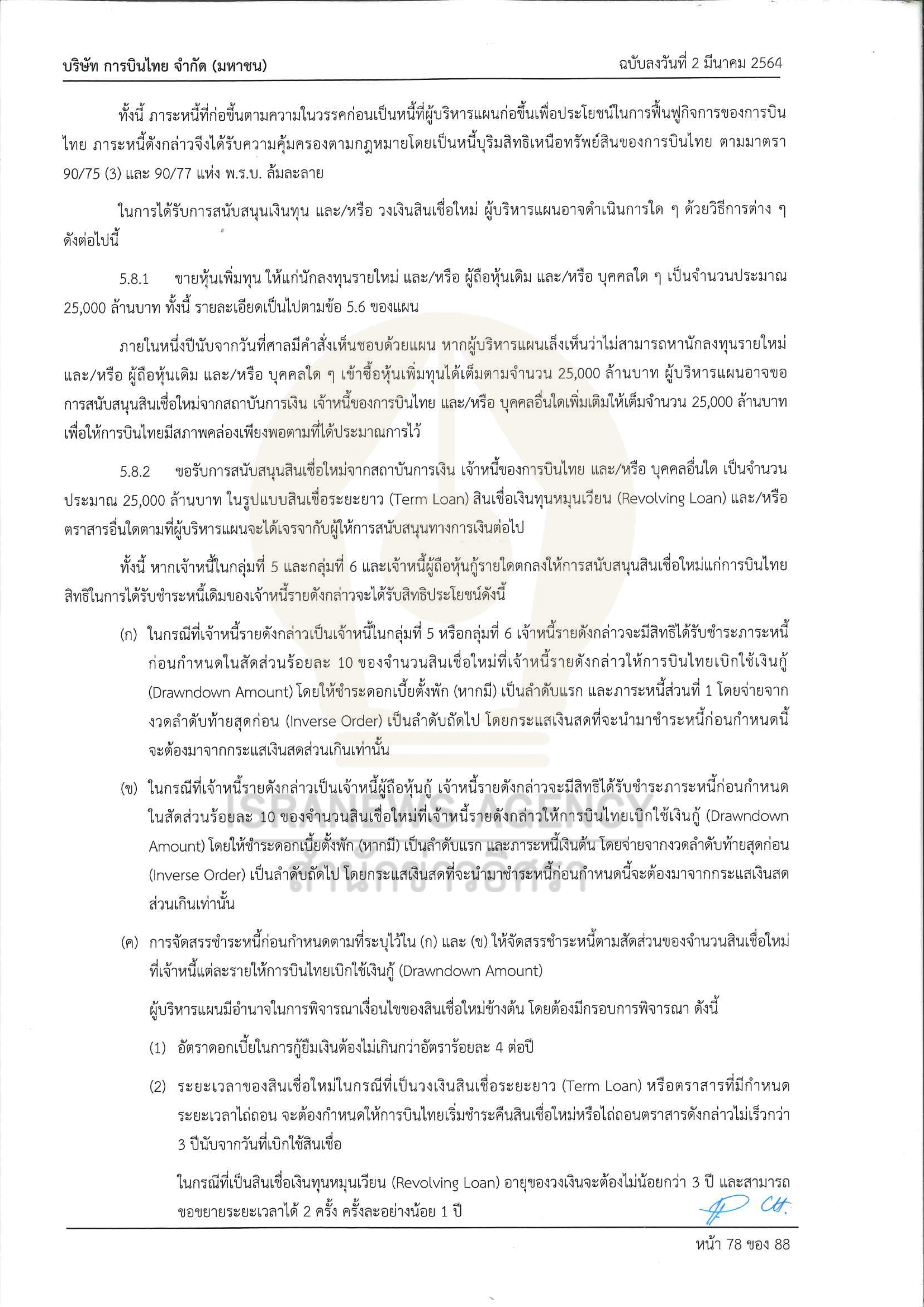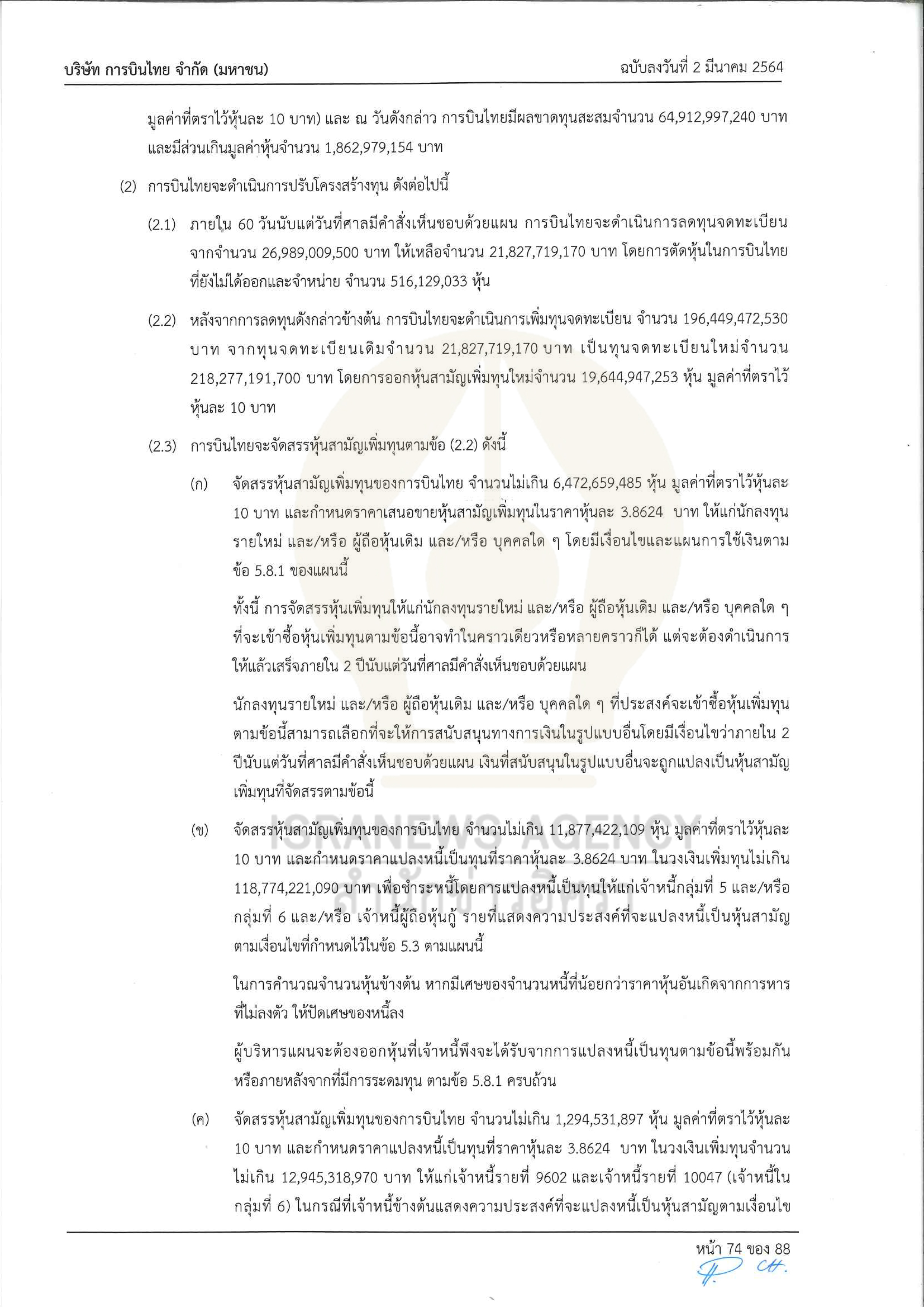 -การจัดสรรหุ้นสามัญเพิ่มทุนของการบินไทย จำนวนไม่เกิน 11,877,422,109 หุ้น มูลค่าที่ตราไว้หุ้นละ10 บาท และกำหนดราคาแปลงหนี้เป็นทุนที่ราคาหุ้นละ 3.8624 บาท ในวงเงินเพิ่มทุนไม่เกิน 118,774,221,090 บาท เพื่อชำระหนี้โดยการแปลงหนี้เป็นทุนให้แก่เจ้าหนี้กลุ่มที่ 5 และ/หรือ กลุ่มที่ 6 และ/หรือ เจ้าหนี้ผู้ถือหุ้นกู้ รายที่แสดงความประสงค์ที่จะแปลงหนี้เป็นหุ้นสามัญ