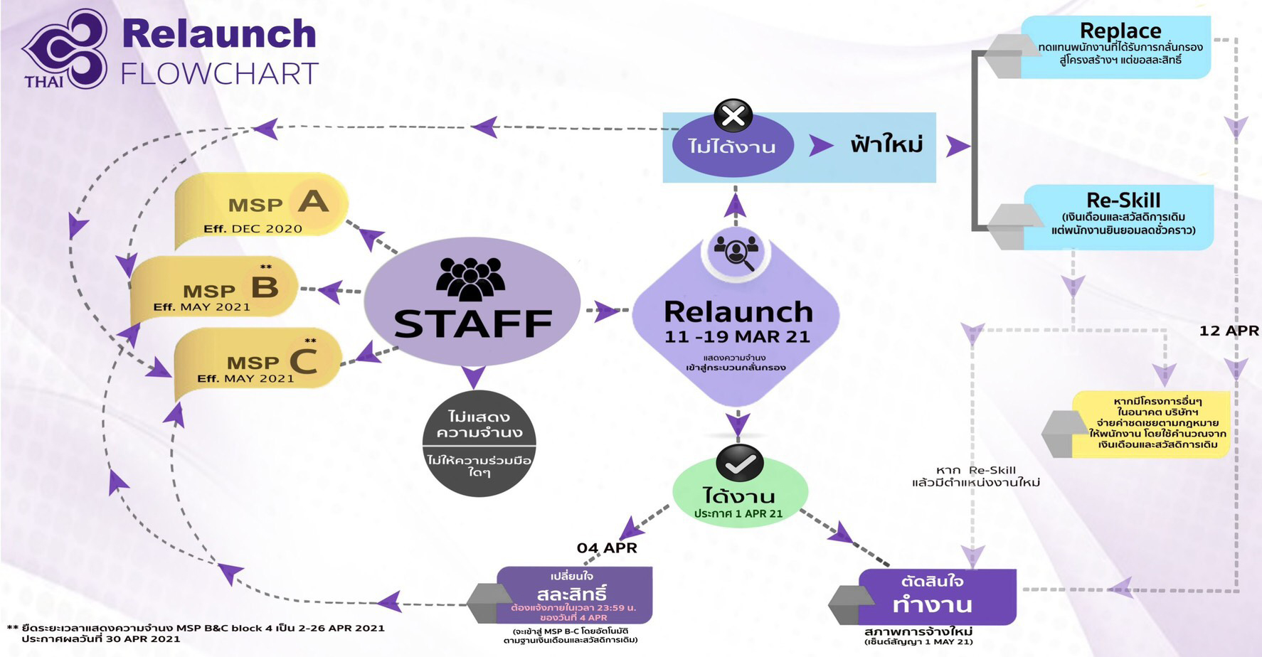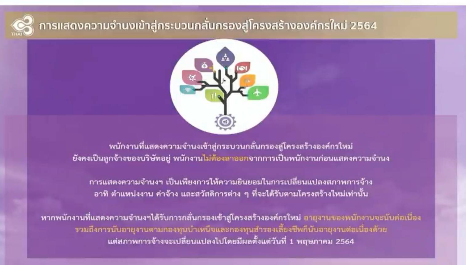 ส่วนความคืบหน้ากรณีบริษัท การบินไทย เปิดให้พนักงานแสดงความจำนงเข้าสู่กระบวนการกลั่นกรองสู่โครงสร้างองค์กรใหม่ 2564 ระหว่างวันที่ 11-19 มี.ค.2564 นั้น ล่าสุดพนักงานการบินไทยยังคงมีความลังเลใจว่า หากแสดงความจำนงเข้าสู่กระบวนการกลั่นกรองฯและได้รับการคัดเลือก สัญญาจ้างใหม่จะเป็นอย่างไร หรือกรณีแสดงความจำนงแล้ว แต่ไม่ได้รับเลือกเข้าโครงใหม่ ซึ่งจะต้องเข้าไปอยู่ในกลุ่มพนักงานฟ้าใหม่และจะถูกเลิกจ้างในอนาคตหรือไม่