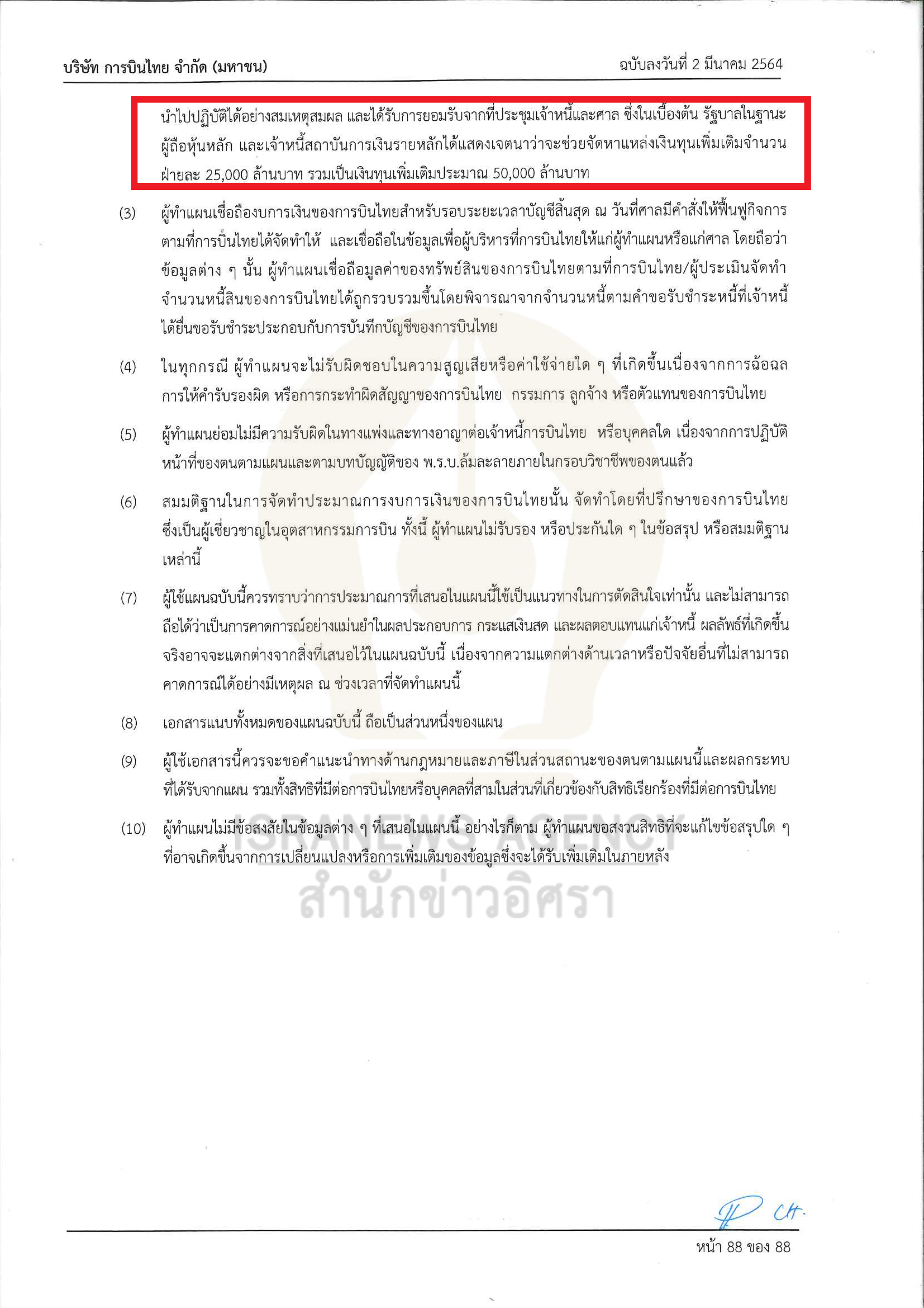 สำนักข่าวอิศรา (www.isranews.org) รายงานว่า จากกรณีผู้ทำแผนฟื้นฟูกิจการของบริษัท การบินไทย จำกัด (มหาชน) ส่งแผนฟื้นฟูกิจการของบริษัท การบินไทย ให้กับเจ้าพนักงานพิทักษ์ทรัพย์ กองฟื้นฟูกิจการของลูกหนี้ กรมบังคับคดี และเจ้าหนี้ของบริษัท การบินไทย เมื่อวันที่ 2 มี.ค.2564 พบว่า ภายใต้แผนฟื้นฟูกิจการฯดังกล่าว บริษัท การบินไทย จะมีการปรับโครงสร้างทุน โดยการลดทุนและเพิ่มทุน ซึ่งมีรายละเอียด คือ