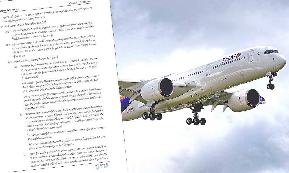 2.หลังจากการลดทุนดังกล่าวข้างต้น การบินไทยจะดำเนินการเพิ่มทุนจดทะเบียน จำนวน 196,449,472,530บาท จากทุนจดทะเบียนเดิมจำนวน 21,827,719,170 บาท เป็นทุนจดทะเบียนใหม่จำนวน 218,277,191,700 บาท โดยการออกหุ้นสามัญเพิ่มทุนใหม่จำนวน 19,644,947,253 หุ้น มูลค่าที่ตราไว้หุ้นละ 10 บาท