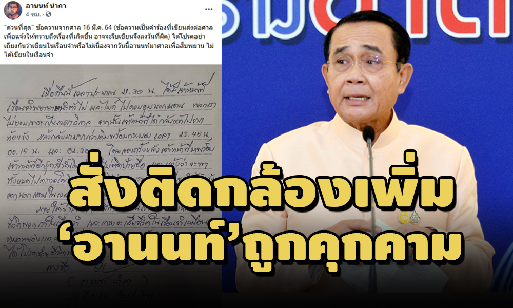 'บิ๊กตู่' สั่งติดกล้องวงจรปิดเพิ่ม หลังเฟซบุ๊ก 'ทนายอาานท์' แพร่จดหมายอ้างถูกผู้คุมคุกคาม 'สมศักดิ์' ปัดไม่ทราบเรื่อง ด้านกรมราชทัณฑ์แจงแยก 'อานนท์'เพื่อตรวจเชื้อโควิดฯ-ยันปฏิบัติตามระเบียบเคร่งครัด