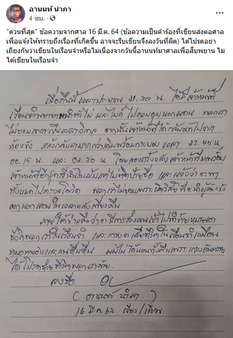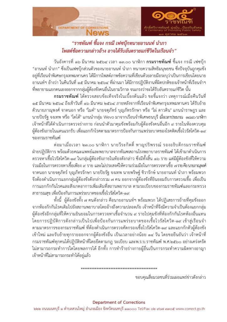 วันเดียวกัน ผู้สื่อข่าวรายงานว่า เมื่อวันที่ 16 มี.ค. 2564 กรมราชทัณฑ์ เผยแพร่เอกสารชี้แจงกรณี เฟซบุ๊ก ‘อานนท์ นำภา’ ที่เป็นเฟซบุ๊กส่วนตัวของนายอานนท์ นำภา ทนายความสิทธิมนุษยชน ปัจจุบันถูกคุมขังอยู่ที่เรือนจำพิเศษกรุงเทพมหานคร กรณีถูกพนักงานสอบสวนฝากขังในการกล่าวหาว่ากระทำผิดตามประมวลกฎหมายอาญา มาตรา 112 มีการโพสต์ภาพเป็นข้อความเขียนด้วยลายมือ อ้างว่า เป็นการเขียนของนายอานนท์เอง เมื่อวันที่ 15 มี.ค. 2564 ว่ามีการปฏิบัติงานที่ผิดปกติของเจ้าหน้าที่เรือนจำ พยายามแยกตนเองออกจากกลุ่มผู้ต้องขังคนอื่นในยามวิกาล เกรงว่าจะได้รับอันตรายถึงแก่ชีวิตนั้น