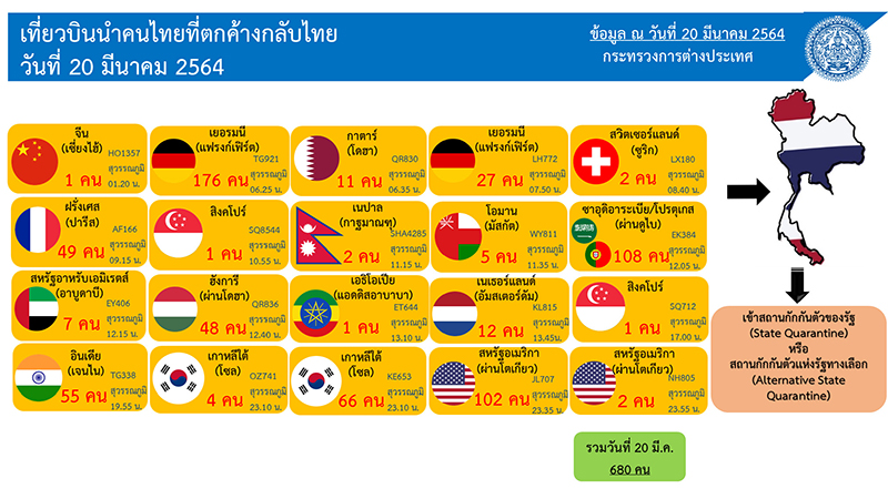 ส่วนกระทรวงการต่างประเทศรายงานว่า วันนี้จะมีคนเดินทางกลับเข้าไทยอีก 680 ราย รวม 20 เที่ยวบิน ประกอบด้วย จีน 1 เที่ยวบิน 1 ราย ฝรั่งเศส 1 เที่ยวบิน 49 ราย สหรัฐอาหรับเอมิเรสต์ 1 เที่ยวบิน 7 ราย อินเดีย 1 ราย 55 ราย เยอรมนี 2 เที่ยวบิน 203 ราย สิงคโปร์ 2 เที่ยวบิน 2 ราย ฮังการี 1 เที่ยวบิน 48 ราย เกาหลีใต้ 2 เที่ยวบิน 70 ราย กาตาร์ 1 เที่ยวบิน 11 ราย เนปาล 1 เที่ยวบิน 2 ราย เแอธิโอเปีย 1 เที่ยวบิน 1 ราย โอมาน 1 เที่ยวบิน 5 ราย เนเธอร์แลนด์ 1 เที่ยวบิน 12 ราย สหรัฐอเมริกา 2 เที่ยวบิน 104 ราย สวิตเซอร์แลนด์ 1 เที่ยวบิน 2 ราย และซาอุดีอาระเบีย/โปตุเกส 1 เที่ยวบิน 108 ราย