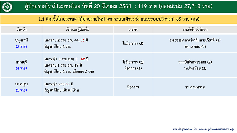 สำนักข่าวอิศรา (www.isranews.org) รายงานว่า เมื่อวันที่ 20 มี.ค.2564 ศูนย์บริหารสถานการณ์โควิด (ศบค.) เปิดเผยสถานการณ์ประจำวัน พบผู้ป่วยรายใหม่ 119 ราย แบ่งเป็นการติดเชื้อในประเทศ 112 ราย เกิดจากระบบเฝ้าระวังและระบบริการฯ 65 ราย เกิดจากการค้นหาเชิงรุกและพบการติดเชื้อในชุมชน 47 ราย และอีก 7 รายเดินทางกลับมาจากต่างประเทศ รวมผู้ป่วยสะสม 27,713 ราย หายป่วยเพิ่ม 62 ราย อยู่ระหว่างรักษาตัวในโรงพยาบาล 1,111 ราย และเสียชีวิต 90 ราย