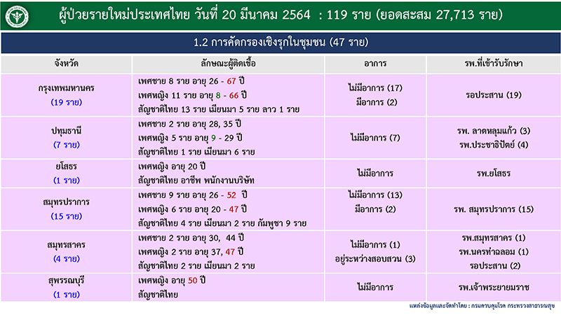 ขณะที่พบผู้ติดเชื้อจากการค้นหาเชิงรุกในชุมชน 47 ราย ราย ประกอบด้วย กทม. 19 ราย ปทุมธานี 7 ราย ยโสธร 1 ราย สมุทรปราการ 15 ราย สมุทรสาคร 4 ราย และสุพรรณบุรี 1 ราย