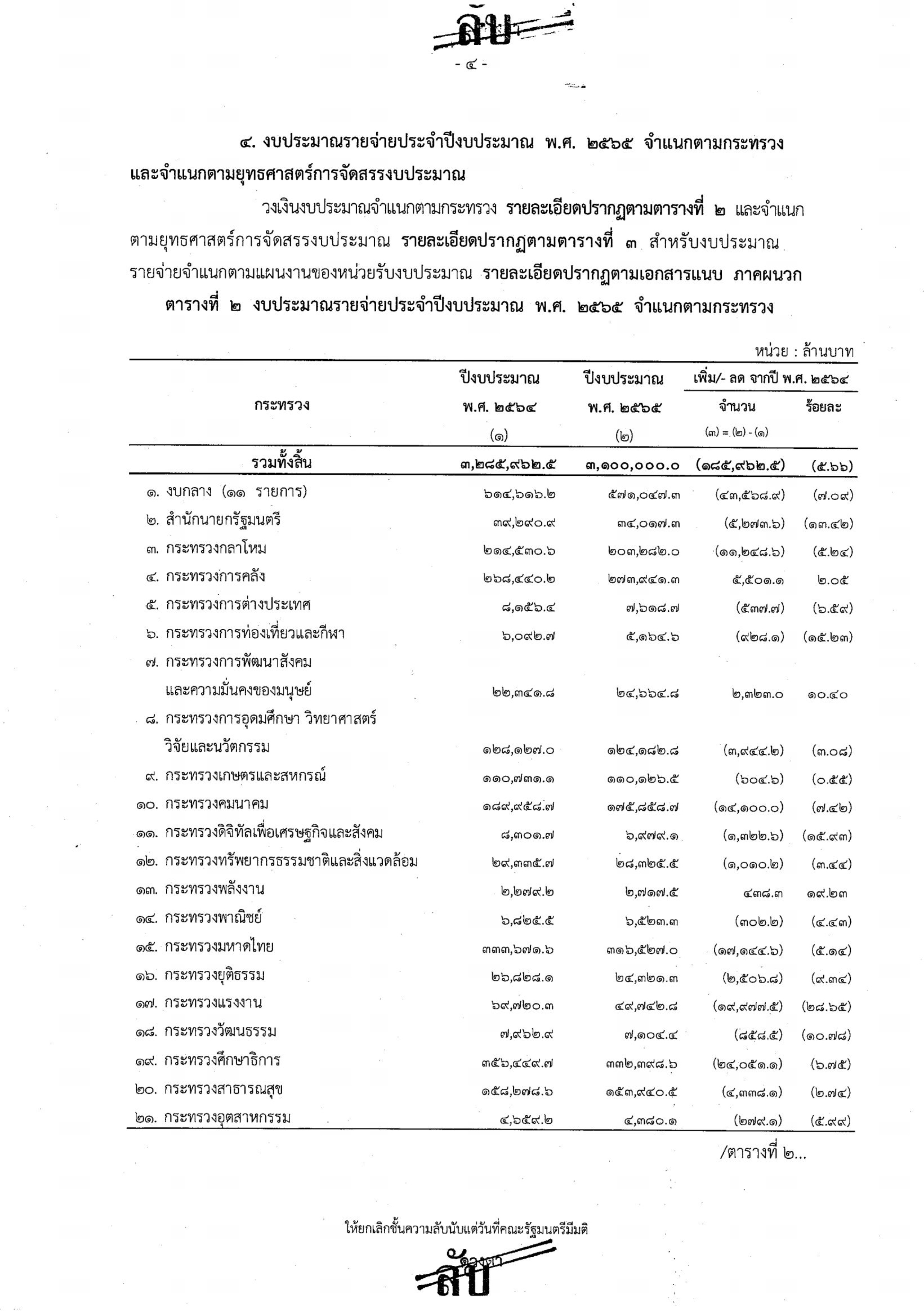 1.กระทรวงศึกษาธิการ มีจำนวน 332,398.63 ล้านบาท เทียบกับปีงบ 2564 ที่มีจำนวน 356,449.68 ล้านบาท ลดลง 24,051.04 ล้านบาท หรือลดลง 6.75%