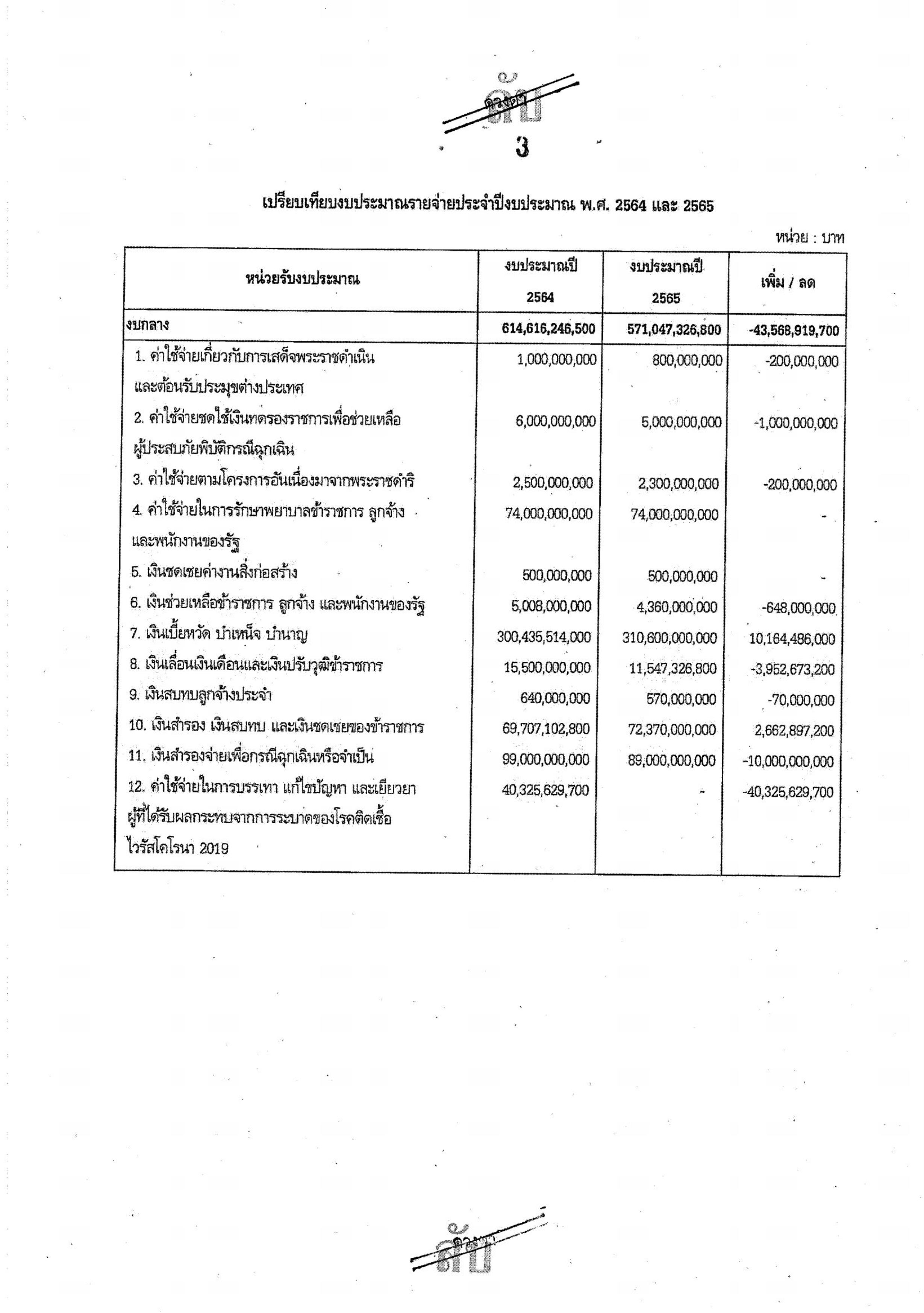 3.ค่าใช้จ่ายตามโครงการอันเนื่องมาจากพระราชดำริ มีจำนวน 2,300 ล้านบาท เทียบกับปีงบ 2564 ที่มีจำนวน 2,500 ล้านบาท หรือลดลง 200 ล้านบาท