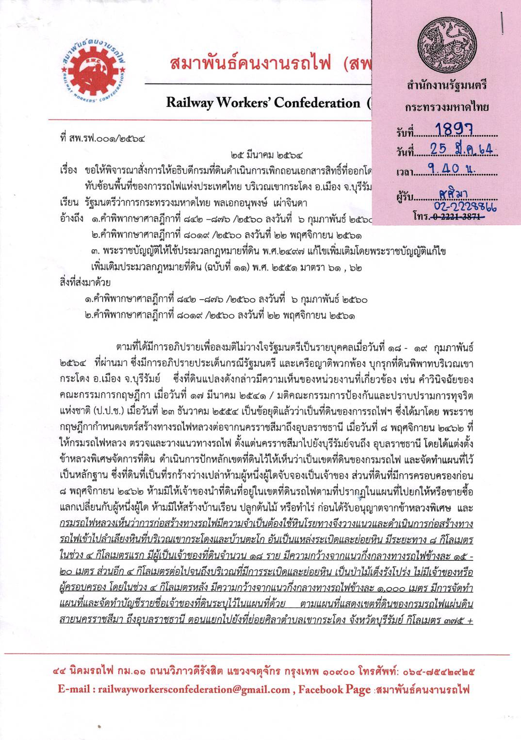 สำหรับหนังสือ สพ.รฟ. ระบุว่า ตามที่ได้มีการอภิปรายไม่ไว้วางใจรัฐมนตรีเป็นรายบุคคลเมื่อวันที่ 18-19 ก.พ.2564 ซึ่งมีการอภิปรายประเด็นกรณีรัฐมนตรี และเครือญาติพี่น้องบุกรุกที่ดินพิพาทบริเวณเขากระโดง อ.เมือง จ.บุรีรัมย์ ซึ่งที่ดินแปลงดังกล่าวมีความเห็นจากหน่วยงานที่เกี่ยวข้อง เช่น คณะกรรมการกฤษฎีกา ,มติคณะกรรมการป้องกันและปราบปรามการทุจริตแห่งชาติ (ป.ป.ช.) และคำพิพากษาศาลฎีกา สรุปได้ว่าที่ดินบริเวณดังกล่าวเป็นที่ดินรถไฟฯ