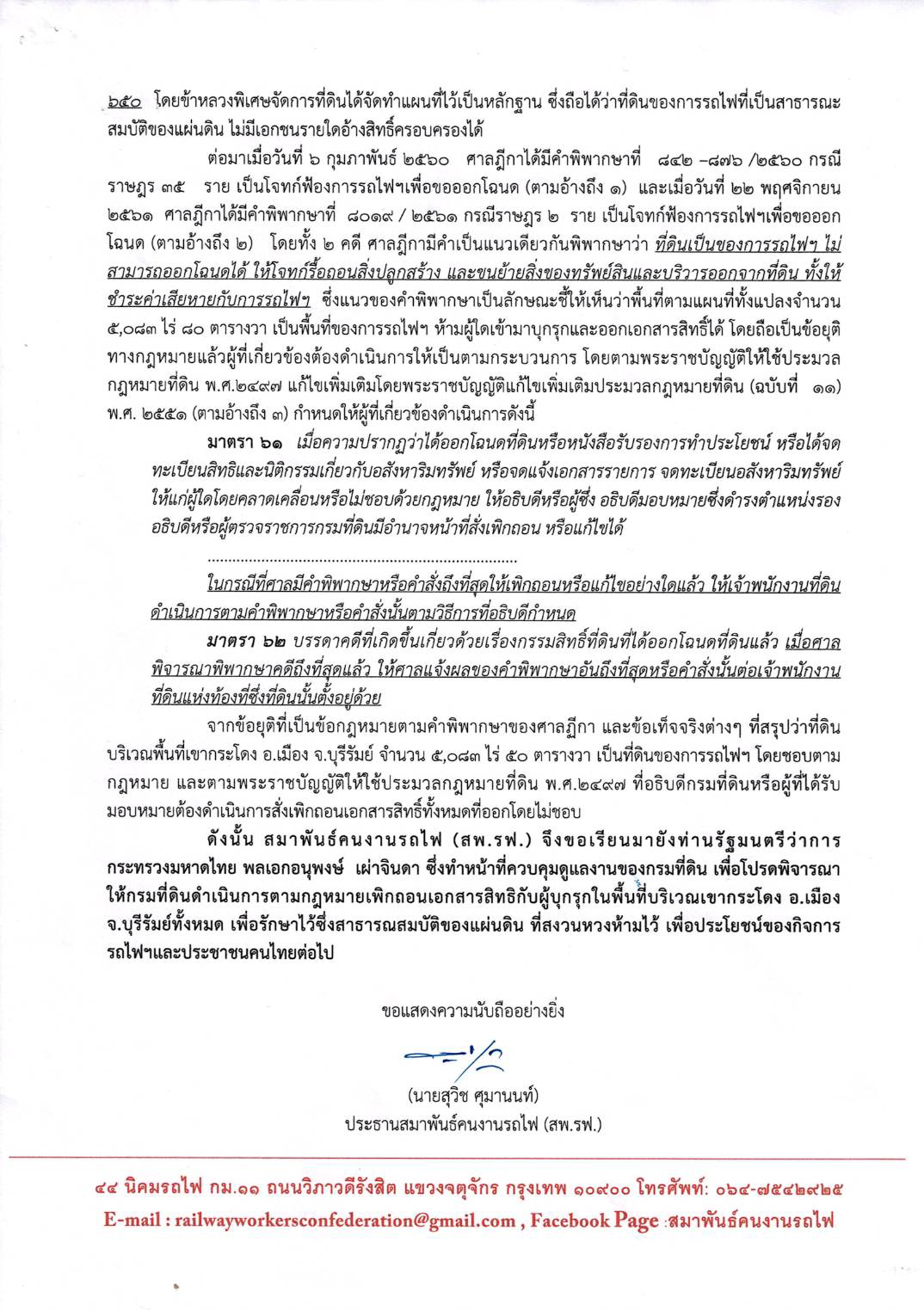 “สพ.รฟ. จึงขอเรียนมายังท่านรมว.มหาดไทย พล.อ.อนุพงษ์ เผ่าจินดา ซึ่งทำหน้าที่ควบคุมดูแลงานของกรมที่ดิน เพื่อโปรดพิจารณาให้กรมที่ดินดำเนินการตามกฎหมาย เพิกถอนเอกสารสิทธิ์กับผู้บุกรุกในพื้นที่บริเวณเขากระโดง อ.เมือง จ.บุรีรัมย์ ทั้งหมด เพื่อรักษาไว้ ซึ่งสาธารณสมบัติของแผ่นดินที่สงวนหวงห้ามไว้ เพื่อประโยชน์กิจการรถไฟฯ และประชาชนคนไทยต่อไป” เนื้อหาหนังสือ สพ.รฟ.ระบุ