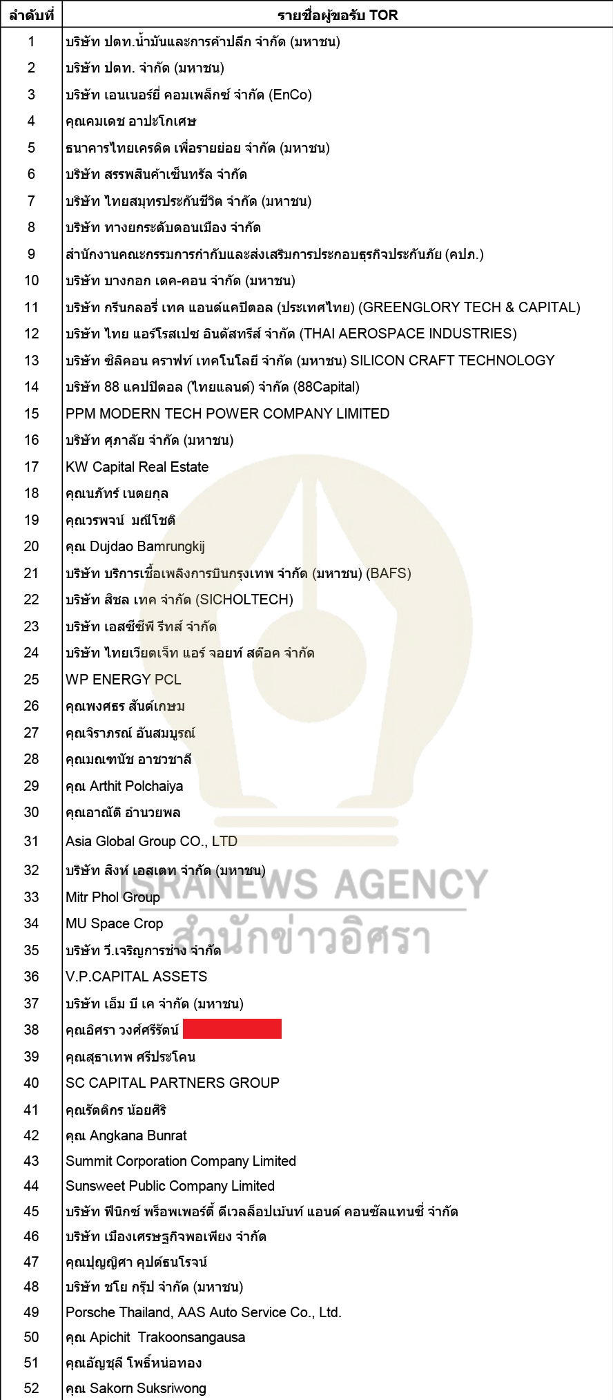 สำหรับบริษัทหรือผู้สนใจเข้าซื้อเอกสารประมูล (ทีโออาร์) มีทั้งสิ้น 52 ราย โดยมีบริษัทชั้นนำเข้าร่วมซื้อซอง เช่น บมจ. ปตท น้ำมันและการค้าปลีก (OR) , บมจ. ปตท. (PTT) บริษัท เอนเนอร์ยี่ คอมเพล็กซ์ จำกัด (EnCo) , ธนาคารไทยเครดิตเพื่อรายย่อย จำกัด (มหาชน) ,บริษัท สรรพสินค้าเซ็นทรัล จำกัด ,บมจ.ไทยสมุทรประกันชีวิต ,บริษัท ทางยกระดับดอนเมือง จำกัด ,บมจ.สิงห์ เอสเตท (S) ,บมจ.บริการเชื้อเพลิงการบินกรุงเทพ (BAF)