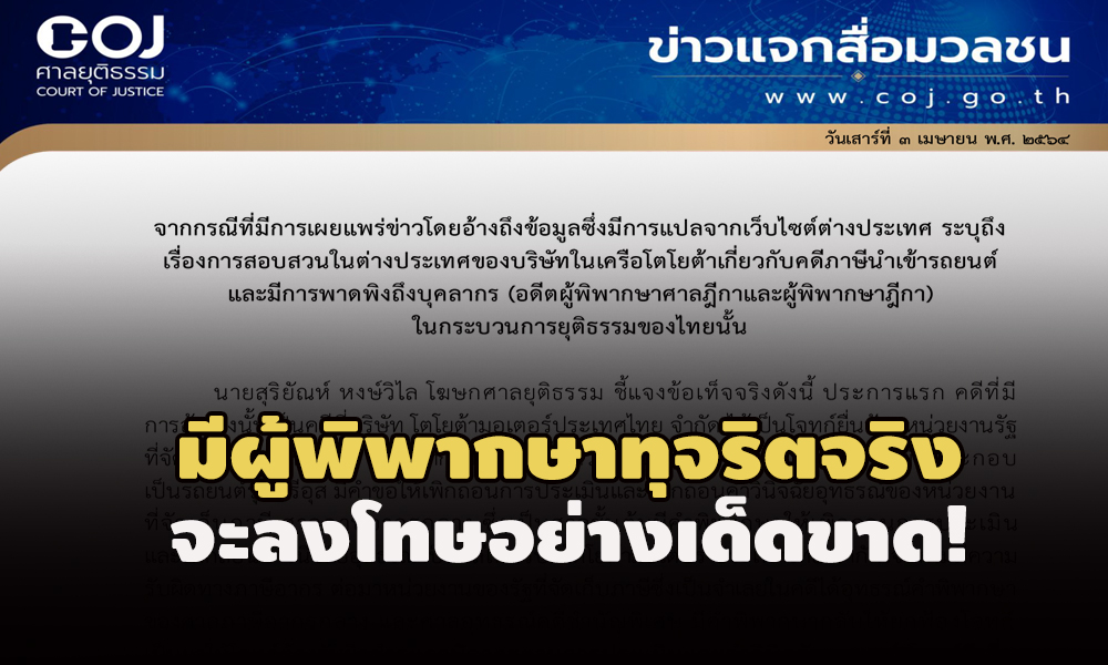 สนง.ศาลยุติธรรม ออกข่าวแจงเป็นทางการ กรณีเว็บไซต์ ตปท.แพร่ข้อมูลลับโตโยต้า สอบสวน บ.ลูกไทย จ่ายสินบน พ.ศาลฎีกาพลิกคดีภาษีพรีอุสหมื่นล้าน ลั่นหากได้รับข้อมูลแน่ชัดผู้พิพากษารายใดกระทำผิดทุจริตต่อหน้าที่จะลงโทษอย่างเด็ดขาด ฐานทำให้เสื่อมเสียต่อเกียรติศักดิ์ทำลายความเป็นกลางของศาล ติงสื่อออกข่าวควรตรวจสอบก่อน เผยศาลอุทธรณ์พิพากษากลับโตโยต้าแพ้จริงอยู่ระหว่างยื่นแก้ฎีกา