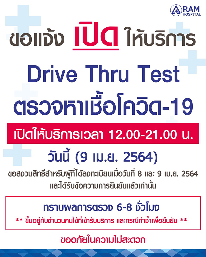 โรงพยาบาลรามคำแหง จึงขอแจ้งว่าพร้อมที่จะกลับมาเปิดให้บริการ Drive Thru Test อีกครั้ง เพื่อช่วยให้ประชาชนเข้าถึงการตรวจหาเชื้อซึ่งจะทำให้การควบคุมการแพร่ระบาดเป็นไปอย่างมีประสิทธิภาพและรวดเร็วยิ่งขึ้น ทั้งนี้จะทราบผลการตรวจ 6-8 ชั่วโมง ขึ้นอยู่กับจำนวนคนไข้ที่เข้ารับบริการ และกรณีทำซ้ำเพื่อยืนยัน ทั้งนี้ขอให้ประชาชนลงทะเบียนผ่านเว็บไซต์เพื่อเข้ารับการตรวจต่อไป