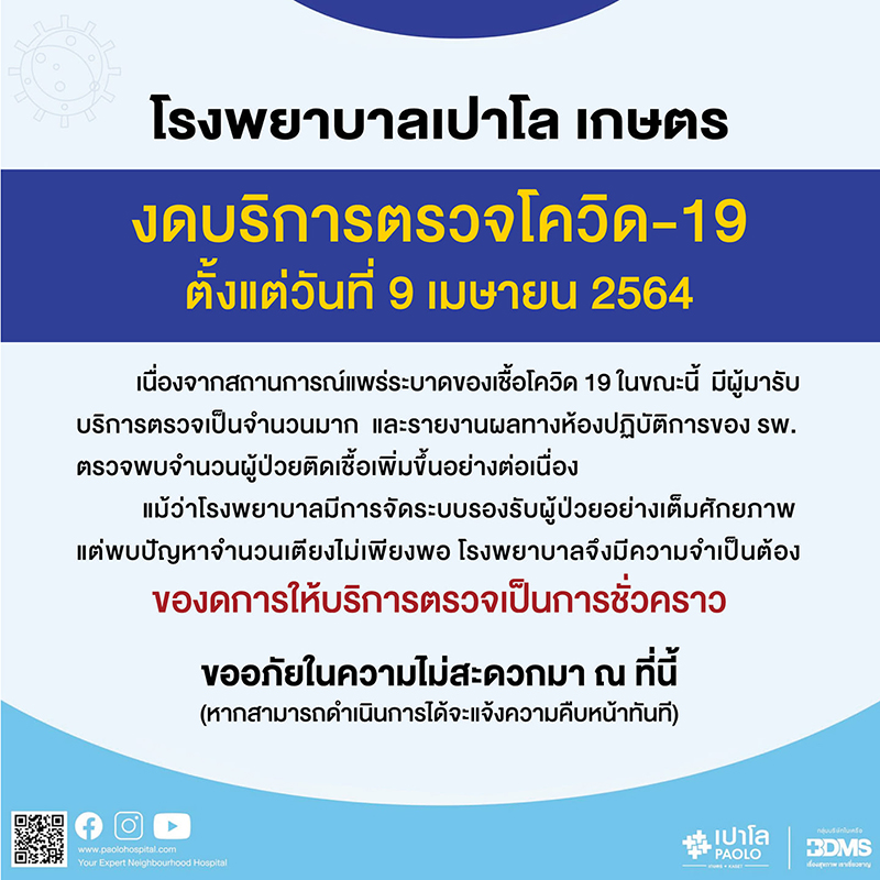 โรงพยาบาลเปาโล เมโมเรียล เกษตรนวมินทร์ แจ้งผ่าน โรงพยาบาลเปาโล เกษตร ประกาศงดตรวจโควิด ตั้งแต่วันที่ 9 เม.ย. เนื่องจากสถานการณ์แพร่ระบาดของเชื้อโควิด ส่งผลให้มีผู้มารับบริการตรวจคัดกรองจำนวนมาก โดยตลอดช่วงเวลาที่ผ่านมาห้องปฏิบัติการของโรงพยาบาลมีการรายงานผลตรวจพบผู้ป่วยติดเชื้อเพิ่มจำนวนสูงขึ้นอย่างต่อเนื่อง ถึงแม้ว่าโรงพยาบาลได้มีการจัดระบบให้การดูแลรองรับผู้ป่วยอย่างเต็มศักยภาพ แต่พบปัญหาจำนวนเตียงไม่เพียงพอ จึงมีความจำเป็นต้องของดการให้บริการตรวจเป็นการชั่วคราว หากสามารถดำเนินการได้จะแจ้งความคืบหน้าทันที